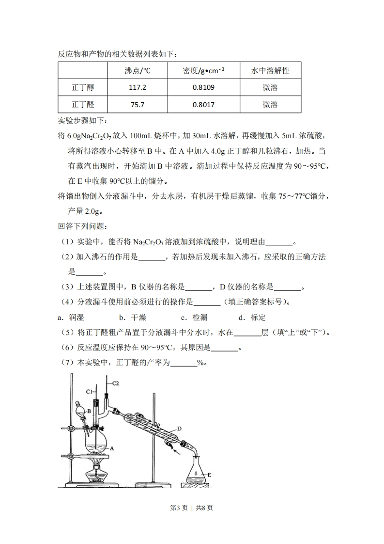 2013年全国统一高考化学试卷(新课标)一、选择题:本题共7小题,每小题6分,在每小题给出的四个选项中,只有一项是符合题目要求的。1.(6分)在一定条件下,动植物油脂与醇反应可制备生物柴油,化学方程式如图所示:RiCOOCH2RICOO RCH2OHR,COOCH+3R'OH催化剂,R2COO R+CHOHR:COOCH2加热R3COO R'CH2OH动植物油脂短链醇生物柴油甘油下列叙述错误的是()A.生物柴油由可再生资源制得B.生物柴油是不同酯组成的混合物C.动植物油脂是高分子化合物D.“地沟油”可用于制备生物柴油2.(6分)下列叙述中,错误的是()A,苯与浓硝酸、浓硫酸共热并保持55~60℃反应生成硝基苯B.苯乙烯在合适条件下催化加氢可生成乙基环己烷C.乙烯和溴的四氯化碳溶液反应生成1,2-二溴乙烷D.甲苯与氯气在光照下反应主要生成2,4-二氯甲苯3.(6分)NA为阿伏加德罗常数的值。下列叙述正确的是()A.1.0L1.0molL1的NaA1O2水溶液中含有的氧原子数为2NA口B.12g石墨烯(单层石墨)中含有六元环的个数为0.5NA口C.25C时pH=13的NaOH溶液中含有OH的数目为0.1Na口D.1mol的羟基与1mol的氢氧根离子所含电子数均为9Na口4.(6分)能正确表示下列反应的离子方程式是()A.浓盐酸与铁屑反应:2Fe+6H一2Fe3+3H2↑B.钠与CuSO4溶液反应:2Na+Cu2一Cu+2NaC.NaHCO3溶液与稀H2SO4反应:CO32-+2H一HO+CO2tD.向FeCl3溶液中加入Mg(OH)2:3Mg(OH)2+2Fe3一2Fe(OH)3+3Mg2第1页|共8页5.(6分)ZEBRA”蓄电池的结构如图所示,电极材料多孔Ni/NiCl2和金属钠之间由钠离子导体制作的陶瓷管相隔。下列关于该电池的叙述错误的是()NaAICla多孔Ni/Nic钠离子导电液体金属钠钢壳A.电池反应中有NaCI生成B.电池的总反应是金属钠还原三价铝离子C.正极反应为:NiCl2+2e一Ni+2ClD,钠离子通过钠离子导体在两电极间移动6.(6分)在1200℃时,天然气脱硫工艺中会发生下列反应:HS(g)+302(g)-SO2(g)+H,0(g)△H22Hsg)+02(g)-S:(g)+2H,0(g)△hH2S(g)+号02(g)-S(g)+H0(g)△H2S(g)-S2(g)△H4则△H4的正确表达式为()A.△-号(△+A~3△H)B.△H-号(3△-△H-△)C.△l-号(△+A,-3△H)D.△H-(△H-AH-3△H)7.(6分)室温时,M(OH)2(s)=M2(aq)+2OH(aq)Ksp=a,c(MP)=b mol-L1时,溶液的pH等于()A.2g()B.28()C.14*28(g)D.14+g()b2二、解答题(共6小题,满分58分)8,(15分)正丁醛是一种化工原料。某实验小组利用如图所示装置合成正丁醛。发生的反应如下:CH3CH2CH2CH2OHCzICH;CH.CH2CHO.H2S0g△第2页|共8页反应物和产物的相关数据列表如下:沸点/C密度/gcm3水中溶解性正丁醇117.20.8109微溶正丁醛75.70.8017微溶实验步骤如下:将6.0gNa2Cr2O,放入100mL烧杯中,加30mL水溶解,再缓慢加入5mL浓硫酸,将所得溶液小心转移至B中。在A中加入4.0g正丁醇和几粒沸石,加热。当有蒸汽出现时,开始滴加B中溶液。滴加过程中保持反应温度为90~95℃,在E中收集90℃以上的馏分。将馏出物倒入分液漏斗中,分去水层,有机层干燥后蒸馏,收集75~77℃馏分,产量2.0g。回答下列问题:(1)实验中,能否将Na2Cr2O,溶液加到浓硫酸中,说明理由(2)加入沸石的作用是若加热后发现未加入沸石,应采取的正确方法是(3)上述装置图中,B仪器的名称是D仪器的名称是(4)分液漏斗使用前必须进行的操作是(填正确答案标号)。a.润湿b.干燥c.检漏d.标定(5)将正丁醛粗产品置于分液漏斗中分水时,水在层(填“上”或“下”)。(6)反应温度应保持在90~95℃,其原因是(7)本实验中,正丁醛的产率为%。第3页|共8页