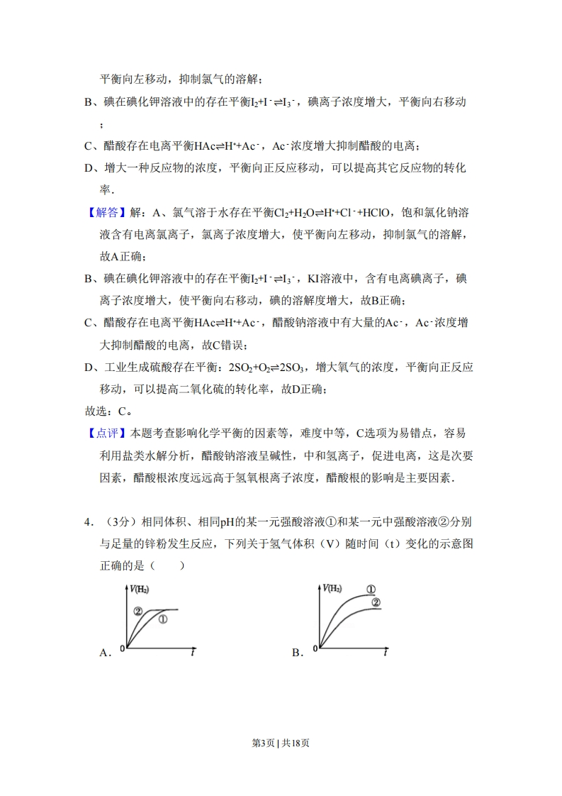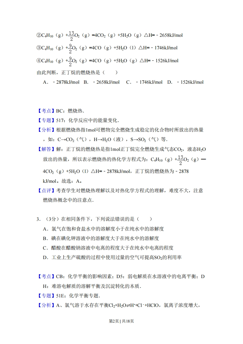 2010年全国统一高考化学试卷(全国卷Ⅱ)套考答来与试题佩折一、选择题1.(3分)下列反应中,可用离子方程式H+OH=HO表示的是()A.NH,C+NaOH△一NaCI+NHt+H,OB.Mg (OH)2+2HCI=MgCl2+2H2OC.NaOH+NaHCO3=Na2CO3+H2OD.NaOH+HNO;=NaNO3+H2O【考点】49:离子方程式的书写.【专题】516:离子反应专题.【分析】稀的强酸与稀的强碱反应生成可溶性盐和水的离子反应可用H+OH=H2O表示,以此来解答,【解答】解:A.该反应为固体与固体加热条件下的反应,不属于离子反应,故A不选:B.Mg(OH)2为不溶性弱碱,不能用H+OH=H2O表示,故B不选:C.NaOH+NaHCO,=Na2CO3+H2O的离子反应为OH-+HCO3=C032+H0,故C不选:D.NaOH+HNO3=NaNO3+HO为稀的强酸与稀的强碱反应生成可溶性盐和水的离子反应,可用H+OH=HO表示,故选D:故选:D。【点评】本题考查离子反应方程式的书写,明确发生的化学反应是解答本题的关键,注意电解质的强弱及离子反应中应保留化学式的物质即可解答,题目难度不大。2.(3分)下面均是正丁烷与氧气反应的热化学方程式(25°,101kPa):①C4H0(g)+13O2(g)=4C02(g)+5H,0(1)△H=-2878 kJ/mol第1页1共18页②C4Ho(g)+1302(g)=4C02(g)+5H20(g)△H=-2658kJ/mol③C4Ho(g)+902(g)=4C0(g)+5H,0(1)△H=-1746kmol④C4Ho(g)+902(g)=4C0(g)+5H,0(g)△H=-1526kmol2由此判断,正丁烷的燃烧热是()A.-2878kJ/mol B.-2658kJ/mol C.-1746kJ/mol D.-1526kJ/mol【考点】BC:燃烧热.【专题】517:化学反应中的能量变化,【分析】根据燃烧热指1mol可燃物完全燃烧生成稳定的化合物时所放出的热量,如:C→C02(气),H→H0(液),S→S02(气)等【解答】解:正丁烷的燃烧热是指1mol正丁烷完全燃烧生成气态CO2,液态H20放出的热量,所以表示燃烧热的热化学方程式为:C4H10(g)+302(g)一4C02(g)+5H20(1)△H=-2878kJ/mol,正丁烷的燃烧热为-2878kJ/mol。故选:A。【点评】考查学生对燃烧热理解以及对热化学方程式的理解,难度不大,注意燃烧热概念中的注意点3.(3分)在相同条件下,下列说法错误的是()A,氯气在饱和食盐水中的溶解度小于在纯水中的溶解度B.碘在碘化钾溶液中的溶解度大于在纯水中的溶解度C.醋酸在醋酸钠溶液中电离的程度大于在纯水中电离的程度D.工业上生产硫酸的过程中使用过量的空气可提高SO2的利用率【考点】CB:化学平衡的影响因素:D5:弱电解质在水溶液中的电离平衡:DH:难溶电解质的溶解平衡及沉淀转化的本质.【专题】51E:化学平衡专题【分析】A、氯气溶于水存在平衡Cl2+H2OH+CI~+HCIO,氯离子浓度增大,第2页1共18页平衡向左移动,抑制氯气的溶解:B、碘在碘化钾溶液中的存在平衡12+1·I3ˉ,碘离子浓度增大,平衡向右移动C、醋酸存在电离平衡HAcH+Ac,Ac~浓度增大抑制醋酸的电离:D、增大一种反应物的浓度,平衡向正反应移动,可以提高其它反应物的转化率。【解答】解:A、氯气溶于水存在平衡C12+H2OH+CI+HCIO,饱和氯化钠溶液含有电离氯离子,氯离子浓度增大,使平衡向左移动,抑制氯气的溶解,故A正确:B、碘在碘化钾溶液中的存在平衡12+II3ˉ,KI溶液中,含有电离碘离子,碘离子浓度增大,使平衡向右移动,碘的溶解度增大,故B正确:C、醋酸存在电离平衡HAcH+Ac,醋酸钠溶液中有大量的Ac~,Ac浓度增大抑制醋酸的电离,故C错误:D、工业生成硫酸存在平衡:2SO2+O2≠2SO3,增大氧气的浓度,平衡向正反应移动,可以提高二氧化硫的转化率,故D正确:故选:C。【点评】本题考查影响化学平衡的因素等,难度中等,C选项为易错点,容易利用盐类水解分析,醋酸钠溶液呈碱性,中和氢离子,促进电离,这是次要因素,醋酸根浓度远远高于氢氧根离子浓度,醋酸根的影响是主要因素,4.(3分)相同体积、相同H的某一元强酸溶液①和某一元中强酸溶液②分别与足量的锌粉发生反应,下列关于氢气体积(V)随时间(t)变化的示意图正确的是(1+V(H2)①②①AB第3页|共18页