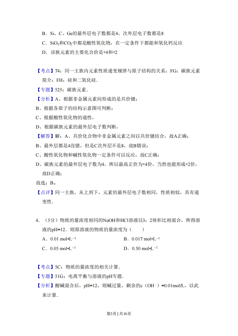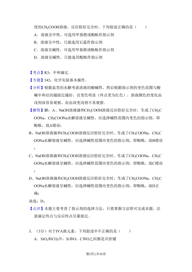 2008年全国统一高考化学试卷(全国卷Ⅱ)事考答案与试题佩折一、选择题(共8小题,每小题5分,满分40分)1.(5分)2008年北京奥运会的“祥云”火炬所用燃料的主要成分是丙烷,下列有关丙烷的叙述中不正确的是()A.分子中碳原子不在一条直线上B.光照下能够发生取代反应C.比丁烷更易液化D.是石油分馏的一种产品【考点】I3:烷烃及其命名.【专题】534:有机物的化学性质及推断.【分析】A、烷烃分子中有多个碳原子应呈锯齿形,丙烷呈角形:B、丙烷等烷烃在光照的条件下可以和氯气发生取代反应:C、烷烃中碳个数越多沸点越高:D、属于石油分馏的产物,是液化石油气的成分之一.【解答】解:A、烷烃分子中有多个碳原子应呈锯齿形,丙烷呈角形,碳原子不在一条直线上,故A正确:B、丙烷等烷烃在光照的条件下可以和氯气发生取代反应,故B正确:C、烷烃中碳个数越多沸点越高,丙烷分子中碳原子数小于丁烷,故丁烷沸点高,更易液化,故C错误:D、丙烷属于石油分馏的产物,是液化石油气的成分之一,故D正确。故选:C。【点评】本题主要考查烷的结构与性质等,难度较小,注意基础知识的积累掌握。2.(5分)实验室现有3种酸碱指示剂,其pH的变色范围如下:甲基橙:3.1~4.4、石蕊:5.0~8.0、酚酞:8.2~10.0用0.1000 mol-L-INa0H溶液滴定未知浓第1页|共16页度的CHCOOH溶液,反应恰好完全时,下列叙述正确的是()A.溶液呈中性,可选用甲基橙或酚酞作指示剂B.溶液呈中性,只能选用石蕊作指示剂C.溶液呈碱性,可选用甲基橙或酚酞作指示剂D.溶液呈碱性,只能选用酚酞作指示剂【考点】R3:中和滴定【专题】542:化学实验基本操作,【分析】根据盐类的水解考虑溶液的酸碱性,然后根据指示剂的变色范围与酸碱中和后的越接近越好,且变色明显(终点变为红色),溶液颜色的变化由浅到深容易观察,而由深变浅则不易观察,【解答】解:A、NaOH溶液滴和CHCOOH溶液反应恰好完全时,生成了CHCOONa,CH:COONa水解溶液呈碱性,应选择碱性范围内变色的指示剂,即酚酞,故A错误:B、NaOH溶液滴和CH3COOH溶液反应恰好完全时,生成了CH:COONa,CHCOON水解溶液呈碱性,应选择碱性范围内变色的指示剂,即酚酞,故B错误C、NaOH溶液滴和CHCOOH溶液反应恰好完全时,生成了CH;COONa,CHCOON水解溶液呈碱性,应选择碱性范围内变色的指示剂,即酚酞,故C错误D、NaOH溶液滴和CH,COOH溶液反应恰好完全时,生成了CHCOONa,CHCOON水解溶液呈碱性,应选择碱性范围内变色的指示剂,即酚酞,故D正确:故选:D。【点评】本题主要考查了指示剂的选择方法,只要掌握方法即可完成本题,注意滴定终点与反应终点尽量接近,3.(5分)对于VA族元素,下列叙述中不正确的是()A.SiO2和CO2中,Si和O、C和O之间都是共价键第2页|共16页B.Si、C、Ge的最外层电子数都是4,次外层电子数都是8C.SiO2和CO2中都是酸性氧化物,在一定条件下都能和氧化钙反应D.该族元素的主要化合价是+4和+2【考点】74:同一主族内元素性质递变规律与原子结构的关系:FG:碳族元素简介:FH:硅和二氧化硅,【专题】525:碳族元素【分析】A、根据非金属元素间形成的是共价键:B、根据各原子的结构示意图可判断:C、根据酸性氧化物的通性,D、根据碳族元素的最外层电子数判断,【解答】解:A、共价化合物中非金属元素之间以共价键结合,故A正确:B、最外层都是4没错,但是C次外层不是8,故B错误:C、酸性氧化物和碱性氧化物一定条件可以反应,故C正确:D、碳族元素的最外层电子数为4,所以最高正价为+4价,当然也能形成+2价,故D正确:故选:B。【点评】同一主族,从上到下,元素的最外层电子数相同,性质相似,具有递变性.4.(5分)物质的量浓度相同的NaOH和HCI溶液以3:2体积比相混合,所得溶液的pH=12.则原溶液的物质的量浓度为()A.0.01 molL-1B.0.017 mol-L-1C.0.05 mol-L-1D.0.50 mol-L-1【考点】5C:物质的量浓度的相关计算.【专题】51G:电离平衡与溶液的pH专题【分析】酸碱混合后,pH=12,则碱过量,剩余的c(OH)=0.01molL,以此来计算.第3页|共16页