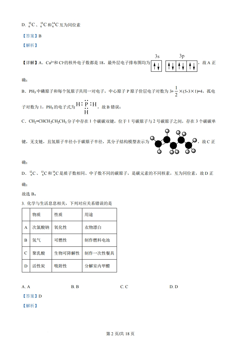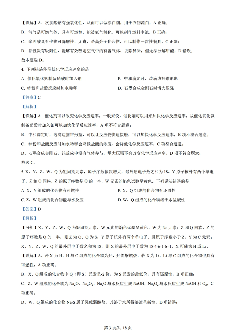 机密★启用前2024年甘肃省普通高校招生统一考试化学注意事项:1.答卷前,考生务必将自己的姓名、准考证号填写在答题卡上。2.回答选释题时,选出每小题答案后,用2B铅笔把答题卡上对应题目的答案标号框涂黑。如需改动,用橡皮擦干净后,再选涂其它答案标号框。回答非选择题时,将答案写在答题卡上。写在本试卷上无效。3.考试结束后,将本试卷和答题卡一并交回。可能用到的相对原子质量Si-28一、选择题:本题共14小题,每小题3分,共42分。在每小题给出的四个选项中,只有一项是符合题目要求的。1.下列成语涉及金属材料的是A.洛阳纸贵B.聚沙成塔C.金戈铁马D.甘之若饴【答案】C【解析】【详解】A,纸的主要成分是纤维素,不是金属材料,A错误:B.沙的主要成分是硅酸盐,不是金属材料,B错误:C.金和铁都是金属,C正确:D.甘之若饴意思是把它看成像糖那样甜,糖类是有机物,不是金属材料,D错误:故选C。2.下列化学用语表述错误的是3s3pA.Ca2+和C的最外层电子排布图均为B.PH3和H,S的电子式分别H:RH和H:S:HHC.CH2=CHCH,CH,CH3的分子结构模型为第1页供18页D.2C、C和C互为同位素【答案】B【解析】3s3p【详解】A.Ca2+和C的核外电子数都是18,最外层电子排布图均为t故A正确:B.PH3中磷原子和每个氢原子共用一对电子,中心原子P原子价层电子对数为3计二×(5-3×1=4,孤电2对数为1,PH的电子式为H:P:H,故B错误HC.CH2=CHCH2CHCH3分子中存在1个碳碳双键,位于1号碳原子与2号碳原子之间,存在3个碳碳单键,无支链,且氢原子半径小于碳原子半径,其分子结构模型表示为故C正确:D.2C、C和C是质子数相同、中子数不同的碳原子,是碳元素的不同核素,互为同位素,故D正确:故选B。3.化学与生活息息相关,下列对应关系错误的是物质性质用途次氯酸钠氧化性衣物漂白B氢气可燃性制作燃料电池C聚乳酸生物可降解性制作一次性餐具D活性炭吸附性分解室内甲醛A.AB.BC.CD.D【答案】D【解析】第2页供18页【详解】A.次氯酸钠有强氧化性,从而可以做漂白剂,用于衣物漂白,A正确:B.氢气是可燃气体,具有可燃性,能被氧气氧化,可以制作燃料电池,B正确:C.聚乳酸具有生物可降解性,无毒,是高分子化合物,可以制作一次性餐具,C正确:D.活性炭有吸附性,能够有效吸附空气中的有害气体、去除异味,但无法分解甲醛,D错误:故本题选D。4.下列措施能降低化学反应速率的是A.催化氧化氨制备硝酸时加入铂B.中和滴定时,边滴边摇锥形瓶C.锌粉和盐酸反应时加水稀释D.石墨合成金刚石时增大压强【答案】C【解析】【详解】A.催化剂可以改变化学反应速率,一般来说,催化剂可以用来加快化学反应速率,故催化氧化氨制备硝酸时加入铂可以加快化学反应速率,A项不符合题意:B.中和滴定时,边滴边摇锥形瓶,可以让反应物快速接触,可以加快化学反应速率,B项不符合题意:C.锌粉和盐酸反应时加水稀释会降低盐酸的浓度,会降低化学反应速率,C项符合题意:D.石墨合成金刚石,该反应中没有气体参与,增大压强不会改变化学反应速率,D项不符合题意:故选C。5.X、Y、Z、W、Q为短周期元素,原子序数依次增大,最外层电子数之和为18。Y原子核外有两个单电子,Z和Q同族,Z的原子序数是Q的一半,W元素的焰色试验呈黄色。下列说法错误的是A.X、Y组成的化合物有可燃性B.X、Q组成的化合物有还原性C.Z、W组成的化合物能与水反应D.W、Q组成的化合物溶于水呈酸性【答案】D【解析】【分析】X、Y、Z、W、Q为短周期元素,W元素的焰色试验呈黄色,W为Na元素:Z和Q同族,Z的原子序数是Q的一半,则Z为O、Q为S:Y原子核外有两个单电子、且原子序数小于Z,Y为C元素:X、Y、Z、W、Q的最外层电子数之和为18,则X的最外层电子数为184-6-16=1,X可能为H或Li【详解】A.若X为H,H与C组成的化合物为烃,烃能够燃烧,若X为L,Li与C组成的化合物也具有可燃性,A项正确:B.X、Q组成的化合物中Q(即S)元素呈-2价,为S元素的最低价,具有还原性,B项正确:C.Z、W组成的化合物为Na2O、Na2O2,Na2O与水反应生成NaOH,Na2O2与水反应生成NaOH和O2,C项正确:D.W、Q组成的化合物N2S属于强碱弱酸盐,其溶于水所得溶液呈碱性,D项错误:第3页共18页