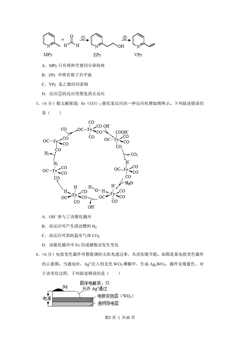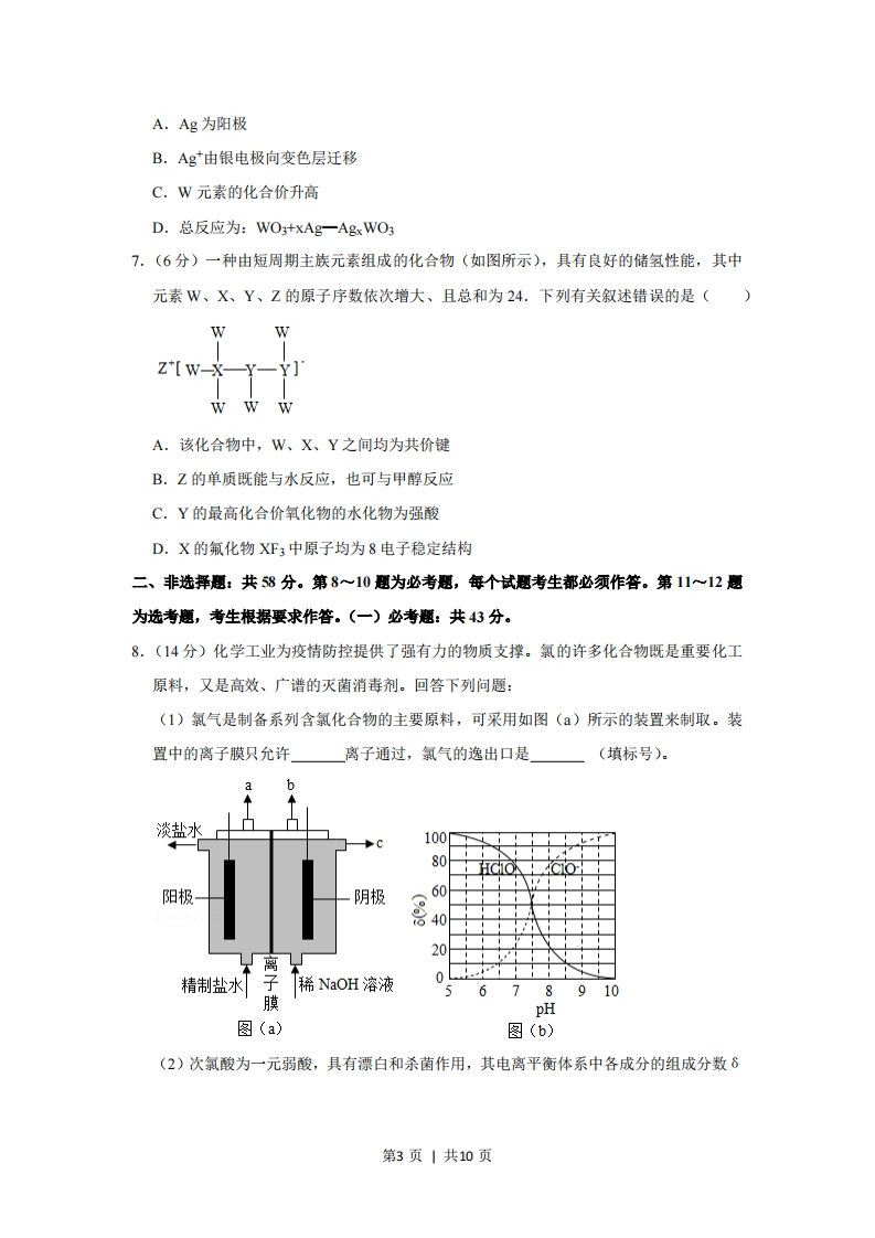 2020年全国统一高考化学试卷(新课标Ⅱ)一、选择题:本题共7小题,每小题6分,共42分。在每小题给出的四个选项中,只有一项是符合题目要求的。1.(6分)北宋沈括《梦溪笔谈》中记载:“信州铅山有苦泉,流以为涧。挹其水熬之则成胆矾,烹胆矾则成铜。熬胆矾铁釜,久之亦化为铜”。下列有关叙述错误的是()A.胆矾的化学式为CuSO4B.胆矾可作为湿法治铜的原料C.“熬之则成胆矾”是浓缩结晶过程D.“熬胆矾铁釜,久之亦化为铜”是发生了置换反应2.(6分)某白色固体混合物由NaCl、KCl、MgsO4、CaCO3中的两种组成,进行如下实验①混合物溶于水,得到澄清透明溶液:②做焰色反应,通过钴玻璃可观察到紫色:③向溶液中加碱,产生白色沉淀。根据实验现象可判断其组成为()A.KCl、NaCIB.KCl、MgSO4C.KCl、CaCO3D.MgsO4、NaCl3.(6分)二氧化碳的过量排放可对海洋生物的生存环境造成很大影响,其原理如图所示。下列叙述错误的是()COCO,+HO-HCO+H*+HCOH+CO=HCOCaCO:Ca2*+CO2(珊瑚礁)A.海水酸化能引起HC03浓度增大、CO32~浓度减小B.海水酸化能促进CaCO3的溶解,导致珊瑚礁减少C.CO2能引起海水酸化,其原理为HC03=H+C032D.使用太阳能、氢能等新能源可改善珊瑚的生存环境4.(6分)吡啶是类似于苯的芳香化合物。2-乙烯基吡啶(VPy)是合成治疗矽肺病药物的原料,可由如下路线合成。下列叙述正确的是()第1页|共10页MPyEPyVPyA.MPy只有两种芳香同分异构体B.EPy中所有原子共平面C.VPy是乙烯的同系物D.反应②的反应类型是消去反应5.(6分)据文献报道:©(CO)5催化某反应的一种反应机理如图所示。下列叙述错误的是()COCO OHCOoc-Fe coCOOHCOcoOC-FeCOOC-FecocoCOH2H2HOC-OC-Fe-COCOCoH20HH、父C0O-HreCOOHA.OH参与了该催化循环B.该反应可产生清洁燃料H2C.该反应可消耗温室气体CO2D.该催化循环中Fe的成键数目发生变化6.(6分)电致变色器件可智能调控太阳光透过率,从而实现节能。如图是某电致变色器件的示意图。当通电时,Ag注入到无色WO3薄膜中,生成AgxWO3,器件呈现蓝色,对于该变化过程,下列叙述错误的是()固体电解质,只Ag允许Ag通过电源电致变色层(WO,)透明导电层第2页|共10页A.Ag为阳极B.Ag由银电极向变色层迁移C.W元素的化合价升高D.总反应为:WO+xAg一Agx WO37.(6分)一种由短周期主族元素组成的化合物(如图所示),具有良好的储氢性能,其中元素W、X、Y、Z的原子序数依次增大、且总和为24.下列有关叙述错误的是()WZ*[w-X—Y一Y]wWWA.该化合物中,W、X、Y之间均为共价键B.Z的单质既能与水反应,也可与甲醇反应C.Y的最高化合价氧化物的水化物为强酸D.X的氟化物XF3中原子均为8电子稳定结构二、非选释题:共58分。第8~10题为必考题,每个试题考生都必须作答。第11~12题为选考题,考生根据要求作答。(一)必考题:共43分。8.(14分)化学工业为疫情防控提供了强有力的物质支撑。氯的许多化合物既是重要化工原料,又是高效、广谱的灭菌消毒剂。回答下列问题:(1)氯气是制备系列含氯化合物的主要原料,可采用如图()所示的装置来制取。装置中的离子膜只允许离子通过,氯气的逸出口是(填标号)。淡盐水100呢%阳极阴极600离20精制盐水子稀NaOH溶液078910膜pH图(a)图(b)(2)次氯酸为一元弱酸,具有漂白和杀菌作用,其电离平衡体系中各成分的组成分数8第3页|共10页