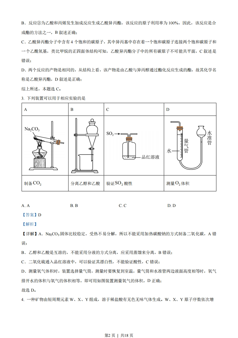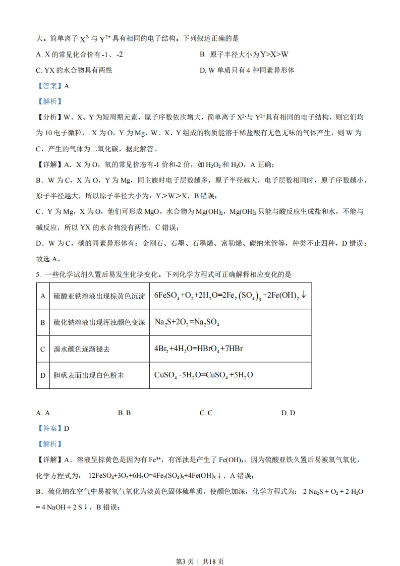 2023年普通高等学校招生全国统一考试理科综合能力测试化学部分(全国乙卷)可能用到的相对原子质量:H1C12016一、选择题:本题共13小题,每小题6分,共78分。在每小题给出的四个选项中,只有一项是符合题目要求的。(化学部分为第7~13题)1.下列应用中涉及到氧化还原反应的是A.使用明矾对水进行净化B.雪天道路上撒盐融雪C.暖贴中的铁粉遇空气放热D.荧光指示牌被照发光【答案】C【解析】【详解】A.使用明矾对水进行净化过程中,明矾电离出的铝离子发生水解生成氢氧化铝胶体,氢氧化铝胶体粒子吸附水中的悬浮颗粒并沉降下来而水变得澄清,该过程中没有任何一种元素的化合价发生变化,因此没有涉及到氧化还原反应,A不符合题意:B.雪天道路上撒盐融雪,是因为雪遇到盐而使其熔点降低并熔化,该过程中没有任何一种元素的化合价发生变化,因此没有涉及到氧化还原反应,B不符合题意:C.暖贴中的铁粉遇空气放热,是因为暖贴中含有的铁粉、碳粉、氯化钠、水等物质,形成当这些物质遇到空气后形成无数微小原电池并开始工作,化学能转化为电能,无数微小原电池堆积在一起使得电能又转化为热能,该过程中铁元素和氧元素的化合价发生变化,因此,该过程涉及到氧化还原反应,C符合题意:D.荧光指示牌被照发光,是因为光被指示牌发生了反射,该过程中没有任何一种元素的化合价发生变化,因此没有涉及到氧化还原反应,D不符合题意:综上所述,本题选C。2.下列反应得到相同的产物,相关叙述错误的是OH0OH①HO②A.①的反应类型为取代反应B.反应②是合成酯的方法之一C.产物分子中所有碳原子共平面D.产物的化学名称是乙酸异丙酯【答案】C【解析】【详解】A.反应①为乙酸和异丙醇在酸的催化下发生酯化反应生成了乙酸异丙酯和水,因此,①的反应类型为取代反应,A叙述正确:第1页」共18页B.反应②为乙酸和丙烯发生加成反应生成乙酸异丙酯,该反应的原子利用率为100%,因此,该反应是合成酯的方法之一,B叙述正确:C.乙酸异丙酯分子中含有4个饱和的碳原子,其中异丙基中存在着一个饱和碳原子连接两个饱和碳原子和一个乙酰氧基,类比甲烷的正四面体结构可知,乙酸异丙酯分子中的所有碳原子不可能共平面,C叙述是错误:D.两个反应的产物是相同的,从结构上看,该产物是由乙酸与异丙醇通过酯化反应生成的酯,故其化学名称是乙酸异丙酯,D叙述是正确:综上所述,本题选C。3.下列装置可以用于相应实验的是BCDNa.COS02E水量气管水品红溶液制备CO2分离乙醇和乙酸验证SO2酸性测量02体积A.AB.BC.CD.D【答案】D【解析】【详解】A.NCO3固体比较稳定,受热不易分解,所以不能采用加热碳酸钠的方式制备二氧化碳,A错误:B.乙醇和乙酸是互溶的,不能采用分液的方式分离,应采用蒸馏来分离,B错误:C.二氧化硫通入品红溶液中,可以验证其漂白性,不能验证酸性,C错误:D.测量氧气体积时,装置选择量气筒,测量时要恢复到室温,量气筒和水准管两边液面高度相等时,氧气排开水的体积与氧气的体积相等,即可用如图装置测量氧气的体积,D正确:故选D。4.一种矿物由短周期元素W、X、Y组成,溶于稀盐酸有无色无味气体生成。W、X、Y原子序数依次增第2页」共18页大。简单离子X2与Y2+具有相同的电子结构。下列叙述正确的是A.X的常见化合价有-1、-2B.原子半径大小为Y>X>WC.YX的水合物具有两性D.W单质只有4种同素异形体【答案】A【解析】【分析】W、X、Y为短周期元素,原子序数依次增大,简单离子X2与Y2+具有相同的电子结构,则它们均为10电子微粒,X为O,Y为Mg,W、X、Y组成的物质能溶于稀盐酸有无色无味的气体产生,则W为C,产生的气体为二氧化碳,据此解答。【详解】A.X为O,氧的常见价态有-1价和-2价,如H2O2和HO,A正确:B.W为C,X为O,Y为Mg,同主族时电子层数越多,原子半径越大,电子层数相同时,原子序数越小,原子半径越大,所以原子半径大小为:Y>W>X,B错误:C.Y为Mg,X为O,他们可形成MgO,水合物为Mg(OH2,Mg(Oh只能与酸反应生成盐和水,不能与碱反应,所以YX的水合物没有两性,C错误:D.W为C,碳的同素异形体有:金刚石、石墨、石墨烯、富勒烯、碳纳米管等,种类不止四种,D错误:故选A。5.一些化学试剂久置后易发生化学变化。下列化学方程式可正确解释相应变化的是A硫酸亚铁溶液出现棕黄色沉淀6FeS0,+02+2H,0=2Fe2(S0,)3+2Fe(OH)2↓B硫化钠溶液出现浑浊颜色变深Na,S+20,=Na,SOC溴水颜色逐渐褪去4Br,+4H,O=HBrO,+7HBr胆矾表面出现白色粉末CuSO,5H,O=CuSO,+5HOA.AB.BC.cD.D【答案】D【解析】【详解】A.溶液呈棕黄色是因为有Fe3+,有浑浊是产生了F(O3,因为硫酸亚铁久置后易被氧气氧化,化学方程式为:12FeS0+302+6H2O=4Fe(S043+4Fe(OH↓,A错误:B.硫化钠在空气中易被氧气氧化为淡黄色固体硫单质,使颜色加深,化学方程式为:2NS+O2+2HzO=4NaOH+2S↓,B错误:第3页」共18页