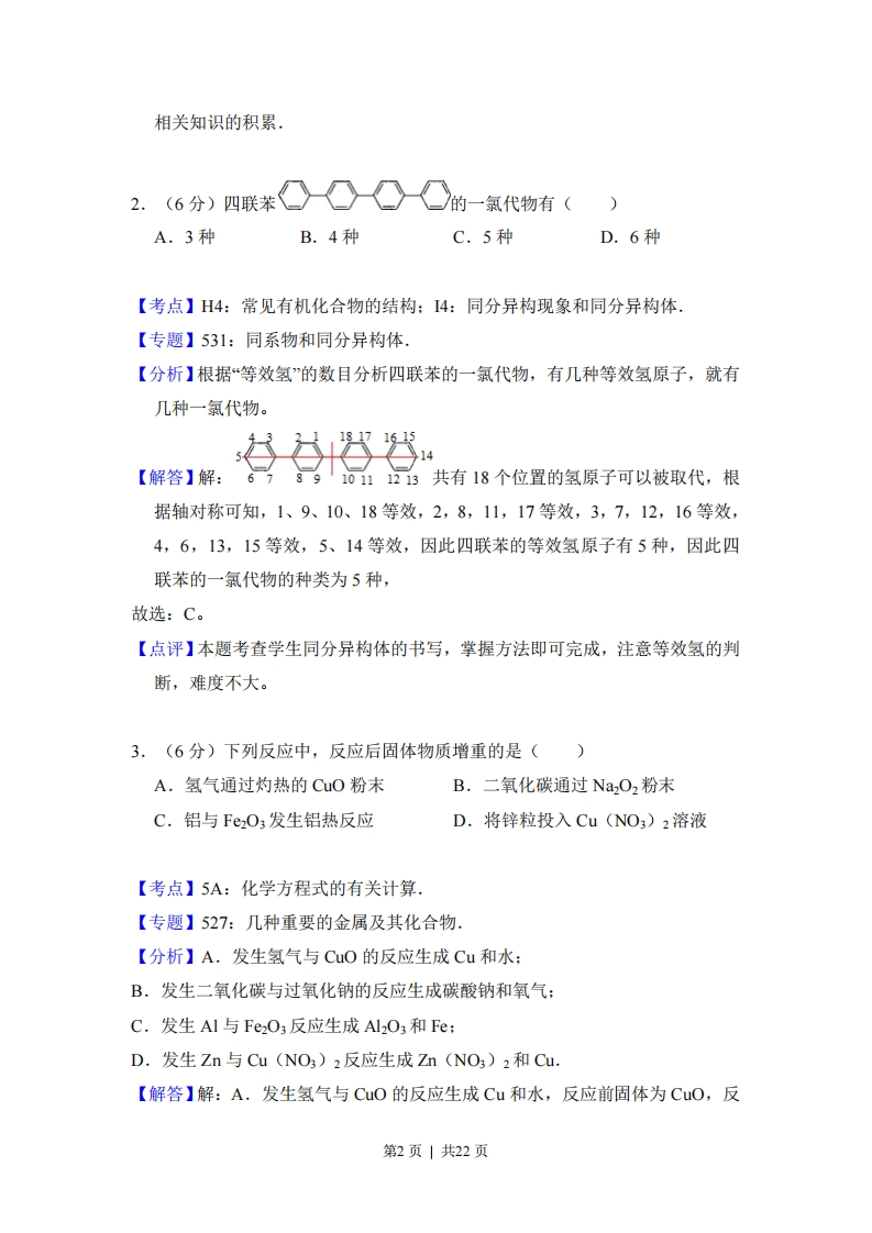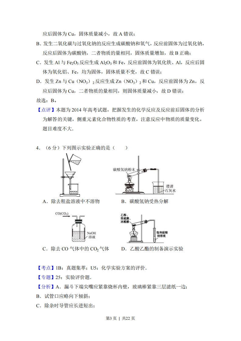 2014年全国统一高考化学试卷(新课标Ⅲ)套考答来与试题解析一、选择题:本题共7小题,每小题6分,在每小题给出的四个选项中,只有一项是符合题目要求的。1.(6分)下列过程没有发生化学反应的是()A.用活性炭去除冰箱中的异味B.用热碱水清除炊具上残留的油污C.用浸泡过高锰酸钾溶液的硅藻土保鲜水果D.用含硅胶、铁粉的透气小袋与食品一起密封包装【考点】18:物理变化与化学变化的区别与联系.【分析】化学变化是指有新物质生成的变化,物理变化是指没有新物质生成的变化,化学变化和物理变化的本质区别是否有新物质生成,A.用活性炭去除冰箱中的异味,是利用活性炭的吸附作用:B.用热碱水清除炊具上残留的油污,是油脂在碱性条件下的水解:C.用浸泡过高锰酸钾溶液的硅藻土保鲜水果,催熟的乙烯被高锰酸钾氧化:D.铁粉具有还原性,能和氧气反应,防止食品被氧化【解答】解:A.用活性炭去除冰箱中的异味:利用活性炭的吸附作用,属于物理变化,没有发生化学变化,故A正确:B.用热碱水清除炊具上残留的油污:油脂在碱性条件下发生较为彻底的水解反应,属于化学变化,故B错误:C.乙烯具有催熟作用,为了延长水果的保鲜期,用高锰酸钾可以除掉乙烯,该过程中乙烯与高锰酸钾反应氧化还原反应,属于化学变化,故C错误:D.硅胶具有吸水性,可以做干燥剂,吸收水分,属于物理变化:铁粉具有还原性,防止食物被氧化,发生氧化还原反应,属于化学变化,故D错误:故选:A。【点评】本题考查了化学变化与物理变化的区别,判断依据是:是否有新物质的生成,题目难度不大,该题各个选项与现实生活接触紧密,比较新颖,注意第1页|共22页相关知识的积累.2.(6分)四联苯○○○○的一氯代物有()A.3种B.4种C.5种D.6种【考点】H4:常见有机化合物的结构:I4:同分异构现象和同分异构体,【专题】531:同系物和同分异构体,【分析】根据等效氢”的数目分析四联苯的一氯代物,有几种等效氢原子,就有几种一氯代物。【解答】解:待5登.10111213共有18个位置的氢原子可以被取代,根据轴对称可知,1、9、10、18等效,2,8,11,17等效,3,7,12,16等效,4,6,13,15等效,5、14等效,因此四联苯的等效氢原子有5种,因此四联苯的一氯代物的种类为5种,故选:C。【点评】本题考查学生同分异构体的书写,掌握方法即可完成,注意等效氢的判断,难度不大。3.(6分)下列反应中,反应后固体物质增重的是()A.氢气通过灼热的CuO粉末B.二氧化碳通过Na2O2粉末C.铝与FezO3发生铝热反应D.将锌粒投入Cu(NO3)2溶液【考点】5A:化学方程式的有关计算.【专题】527:几种重要的金属及其化合物.【分析】A.发生氢气与CuO的反应生成Cu和水:B.发生二氧化碳与过氧化钠的反应生成碳酸钠和氧气:C.发生Al与Fe2O3反应生成Al2O3和Fe:D.发生Zn与Cu(NO3)2反应生成Zn(NO3)2和Cu.【解答】解:A.发生氢气与CuO的反应生成Cu和水,反应前固体为CuO,反第2页|共22页应后固体为Cu,固体质量减小,故A错误:B.发生二氧化碳与过氧化钠的反应生成碳酸钠和氧气,反应前固体为过氧化钠,反应后固体为碳酸钠,二者物质的量相同,固体质量增加,故B正确:C.发生Al与Fe2O3反应生成Al2O3和Fe,反应前固体为氧化铁、Al,反应后固体为氧化铝、Fe,均为固体,固体质量不变,故C错误:D.发生Zn与Cu(NO3)2反应生成Zn(NO3)2和Cu,反应前固体为Zn,反应后固体为Cu,二者物质的量相同,则固体质量减小,故D错误:故选:B。【点评】本题为2014年高考试题,把握发生的化学反应及反应前后固体的分析为解答的关键,侧重元素化合物性质的考查,注意反应中物质的质量变化,题目难度不大,4.(6分)下列图示实验正确的是()碳酸氢钠粉末麦)澄清国石灰水A.除去粗盐溶液中不溶物B,碳酸氢钠受热分解C0C0)NaOH和碳利溶液C.除去C0气体中的CO2气体D.乙酸乙酯的制备演示实验【考点】1B:真题集萃;U5:化学实验方案的评价.【专题】25:实验评价题.【分析】A.漏斗下端尖嘴应紧靠烧杯内壁,玻璃棒紧靠三层滤纸一边:B.试管口应略向下倾斜:C.除杂时导管应长进短出:第3页|共22页