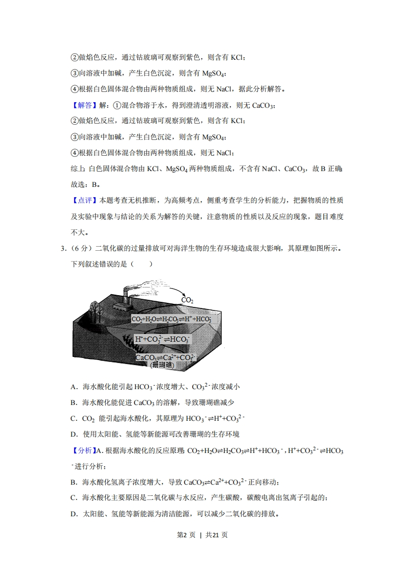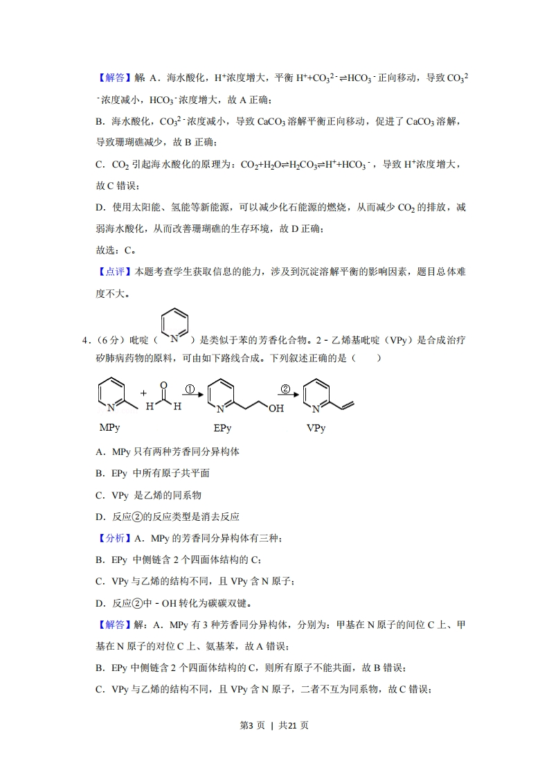 2020年全国统一高考化学试卷(新课标Ⅱ)◆考答案与试题解折一、选择题:本愿共7小题,每小题6分,共42分。在每小题给出的四个选项中,只有一项是符合题目要求的。1.(6分)北宋沈括《梦溪笔谈》中记载:“信州铅山有苦泉,流以为涧。挹其水熬之则成胆矾,烹胆矾则成铜。熬胆矾铁釜,久之亦化为铜”。下列有关叙述错误的是()A.胆矾的化学式为CuSO4B.胆矾可作为湿法治铜的原料C.“熬之则成胆矾”是浓缩结晶过程D.“熬胆矾铁釜,久之亦化为铜”是发生了置换反应【分析】“信州铅山县有苦泉,流以为涧。挹其水熬之则成胆矾。烹胆矾则成铜熬胆矾铁釜,久之亦化为铜。”由题意可知,“苦泉”泉水中含有硫酸铜,硫酸铜溶液蒸发得到硫酸铜晶体,从溶液中获取晶体,熬胆矾铁釜,久之亦化为铜,是发生了:F+CuSO4=Cu+FeSO4,硫酸铜与Fe置换反应生成Cu,据此解答。【解答】解:A.胆矾是硫酸铜晶体,“胆矾”化学式为CuSO45HO,故A错误:B,胆矾是硫酸铜晶体,熬胆矾铁釜,久之亦化为铜,是发生了:F+CuSO4=Cu+FSO4,则胆矾可作为湿法治铜的原料,故B正确:C.挹其水熬之则成胆矾,硫酸铜溶液蒸发得到硫酸铜晶体,是浓缩结晶过程,故C正确:D.熬胆矾铁釜,久之亦化为铜,是发生了:Fe+CuSO4=Cu+FeSO4,硫酸铜与Fe置换反应生成Cu,属于置换反应,故D正确:故选:A。【点评】本题为信息题,明确题目中所给的信息以及C及其化合物的性质是解本题关键,试题侧重基础知识的考查,有利于提高学生获取信息利用信息解答问题能力。2.(6分)某白色固体混合物由NaCl、KCl、MgSO4、CaCO3中的两种组成,进行如下实验①混合物溶于水,得到澄清透明溶液:②做焰色反应,通过钴玻璃可观察到紫色:③向溶液中加碱,产生白色沉淀。根据实验现象可判断其组成为()A.KCl、NaCIB.KCl、MgSO4C.KCl、CaCO3D.MgsO4、NaCl【分析】①混合物溶于水,得到澄清透明溶液,则无CCO3:第1页|共21页②做焰色反应,通过钴玻璃可观察到紫色,则含有KC:③向溶液中加碱,产生白色沉淀,则含有MgSO4:④根据白色固体混合物由两种物质组成,则无NaCl,据此分析解答。【解答】解:①混合物溶于水,得到澄清透明溶液,则无CCO3:②做焰色反应,通过钴玻璃可观察到紫色,则含有KC:③向溶液中加碱,产生白色沉淀,则含有Mg$O4:④根据白色固体混合物由两种物质组成,则无NaCl:综上白色固体混合物由KCl、MgsO4两种物质组成,不含有NaCl、CaCO3,故B正确故选:B。【点评】本题考查无机推断,为高频考点,侧重考查学生的分析能力,把握物质的性质及实验中现象与结论的关系为解答的关键,注意物质的性质以及反应的现象,题目难度不大。3.(6分)二氧化碳的过量排放可对海洋生物的生存环境造成很大影响,其原理如图所示。下列叙述错误的是()室c02CO+HO-HCO-H*+HCOH+COHCOCaCO:-Ca2++CO2鹰(珊瑚礁)A.海水酸化能引起HC03浓度增大、CO32~浓度减小B.海水酸化能促进CCO3的溶解,导致珊瑚礁减少C.CO2能引起海水酸化,其原理为HC03=H+C032D.使用太阳能、氢能等新能源可改善珊瑚的生存环境【分析】A.根据海水酸化的反应原理CO2+H2O=H2CO3=H+HCO3ˉ,H+CO32·=HCO3·进行分析:B.海水酸化氢离子浓度增大,导致CaC03=Ca2++C032-正向移动:C.海水酸化主要原因是二氧化碳与水反应,产生碳酸,碳酸电离出氢离子引起的:D.太阳能、氢能等新能源为清洁能源,可以减少二氧化碳的排放。第2页|共21页【解答】解A.海水酸化,H+浓度增大,平衡H+C032=HC03~正向移动,导致C032·浓度减小,HCO3浓度增大,故A正确:B.海水酸化,CO32~浓度减小,导致CaCO3溶解平衡正向移动,促进了CaCO3溶解,导致珊瑚礁减少,故B正确:C.CO2引起海水酸化的原理为:CO2+H2O=H2CO3=H+HCO3°,导致H浓度增大,故C错误:D.使用太阳能、氢能等新能源,可以减少化石能源的燃烧,从而减少CO2的排放,减弱海水酸化,从而改善珊瑚礁的生存环境,故D正确:故选:C。【点评】本题考查学生获取信息的能力,涉及到沉淀溶解平衡的影响因素,题目总体难度不大。4.(6分)吡啶()是类似于苯的芳香化合物。2-乙烯基吡啶(VPy)是合成治疗矽肺病药物的原料,可由如下路线合成。下列叙述正确的是()OHMPyEPyVPyA.MPy只有两种芳香同分异构体B.EPy中所有原子共平面C.VPy是乙烯的同系物D.反应②的反应类型是消去反应【分析】A.MPy的芳香同分异构体有三种:B.Py中侧链含2个四面体结构的C:C.VPy与乙烯的结构不同,且VPy含N原子:D.反应②中-OH转化为碳碳双键。【解答】解:A.MPy有3种芳香同分异构体,分别为:甲基在N原子的间位C上、甲基在N原子的对位C上、氨基苯,故A错误:B.EPy中侧链含2个四面体结构的C,则所有原子不能共面,故B错误:C.VPy与乙烯的结构不同,且VPy含N原子,二者不互为同系物,故C错误:第3页|共21页