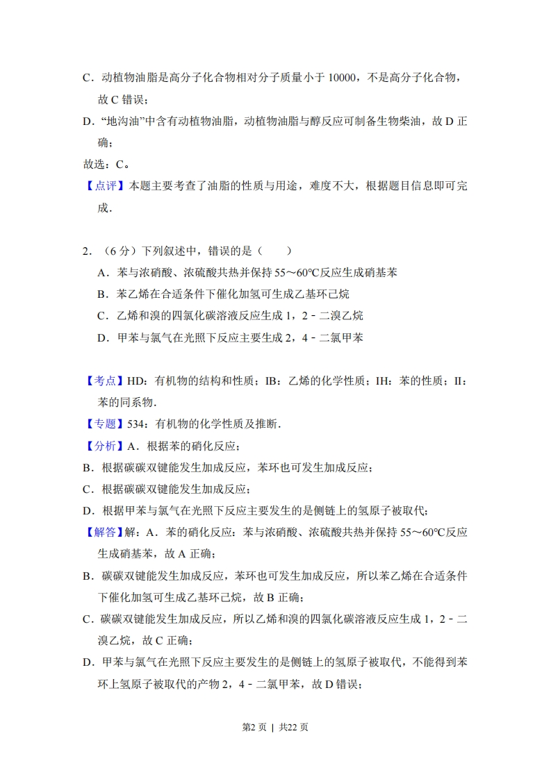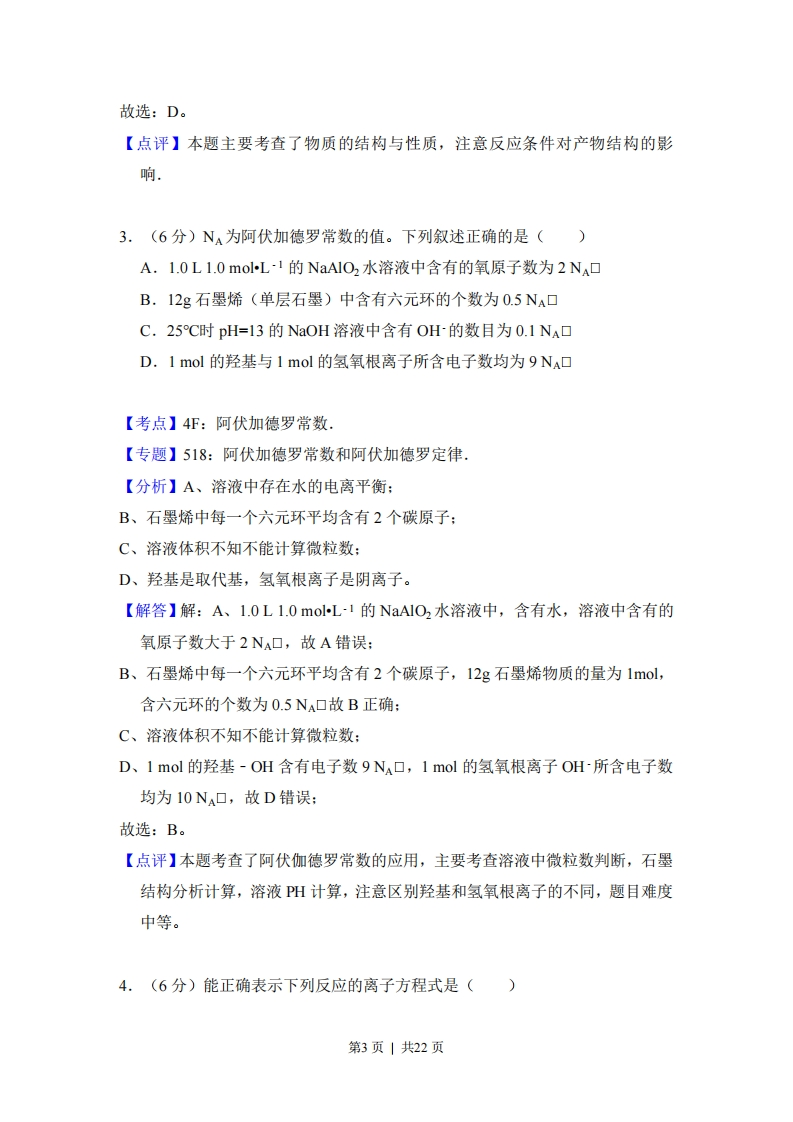 2013年全国统一高考化学试卷(新课标Ⅱ)事考答来与试想解析一、选择题:本题共7小题,每小题6分,在每小题给出的四个选项中,只有一项是符合题目要求的.1.(6分)在一定条件下,动植物油脂与醇反应可制备生物柴油,化学方程式RCOOCH2RiCOO R'CH2OHRC00H+3R'OH催化剂RCOO R'十CHOHR;COOCH2加热R:COO RCH2OH动植物油脂短链醇生物柴油甘油如图所示:下列叙述错误的是()A.生物柴油由可再生资源制得B.生物柴油是不同酯组成的混合物C.动植物油脂是高分子化合物D.“地沟油”可用于制备生物柴油【考点】H:油脂的性质、组成与结构:L1:有机高分子化合物的结构和性质.【专题】534:有机物的化学性质及推断,【分析】A.生物柴油其原料取自可再生的动植物资源:B.生物柴油通常是指以动植物油脂为原料生产的、以脂肪酸甲酯为主要成份的液体燃料:C.相对分子质量在10000以上的有机化合物为高分子化合物:D.“地沟油”中含有动植物油脂,动植物油脂与醇反应可制备生物柴油:【解答】解:A.生物柴油由可再生资源制得,故A正确:B,生物柴油通常是指以动植物油脂为原料生产的、以不同脂肪酸甲酯组成的混合物,故B正确:第1页|共22页C.动植物油脂是高分子化合物相对分子质量小于10000,不是高分子化合物,故C错误:D.“地沟油”中含有动植物油脂,动植物油脂与醇反应可制备生物柴油,故D正确:故选:C。【点评】本题主要考查了油脂的性质与用途,难度不大,根据题目信息即可完成2.(6分)下列叙述中,错误的是()A.苯与浓硝酸、浓硫酸共热并保持55~60℃反应生成硝基苯B.苯乙烯在合适条件下催化加氢可生成乙基环己烷C.乙烯和溴的四氯化碳溶液反应生成1,2-二溴乙烷D.甲苯与氯气在光照下反应主要生成2,4-二氯甲苯【考点】HD:有机物的结构和性质:B:乙烯的化学性质:IH:苯的性质:Ⅱ:苯的同系物【专题】534:有机物的化学性质及推断.【分析】A.根据苯的硝化反应:B.根据碳碳双键能发生加成反应,苯环也可发生加成反应:C.根据碳碳双键能发生加成反应:D.根据甲苯与氯气在光照下反应主要发生的是侧链上的氢原子被取代:【解答】解:A.苯的硝化反应:苯与浓硝酸、浓硫酸共热并保持55~60℃反应生成硝基苯,故A正确:B.碳碳双键能发生加成反应,苯环也可发生加成反应,所以苯乙烯在合适条件下催化加氢可生成乙基环己烷,故B正确:C.碳碳双键能发生加成反应,所以乙烯和溴的四氯化碳溶液反应生成1,2-二溴乙烷,故C正确:D.甲苯与氯气在光照下反应主要发生的是侧链上的氢原子被取代,不能得到苯环上氢原子被取代的产物2,4-二氯甲苯,故D错误:第2页|共22页故选:D。【点评】本题主要考查了物质的结构与性质,注意反应条件对产物结构的影响3.(6分)NA为阿伏加德罗常数的值。下列叙述正确的是()A.1.0L1.0molL1的NaA1O2水溶液中含有的氧原子数为2N.口B.12g石墨烯(单层石墨)中含有六元环的个数为0.5NA口C.25C时pH=13的NaOH溶液中含有OH的数目为0.1Na口D.1mol的羟基与1mol的氢氧根离子所含电子数均为9NA口【考点】4F:阿伏加德罗常数.【专题】518:阿伏加德罗常数和阿伏加德罗定律.【分析】A、溶液中存在水的电离平衡:B、石墨烯中每一个六元环平均含有2个碳原子:C、溶液体积不知不能计算微粒数:D、羟基是取代基,氢氧根离子是阴离子。【解答】解:A、1.0L1.0molL1的NaA1O2水溶液中,含有水,溶液中含有的氧原子数大于2NA口,故A错误:B、石墨烯中每一个六元环平均含有2个碳原子,12g石墨烯物质的量为1ol,含六元环的个数为0.5NA口故B正确:C、溶液体积不知不能计算微粒数:D、1mol的羟基-OH含有电子数9Na口,1mol的氢氧根离子OH所含电子数均为10NA口,故D错误:故选:B。【点评】本题考查了阿伏伽德罗常数的应用,主要考查溶液中微粒数判断,石墨结构分析计算,溶液PH计算,注意区别羟基和氢氧根离子的不同,题目难度中等。4.(6分)能正确表示下列反应的离子方程式是()第3页|共22页