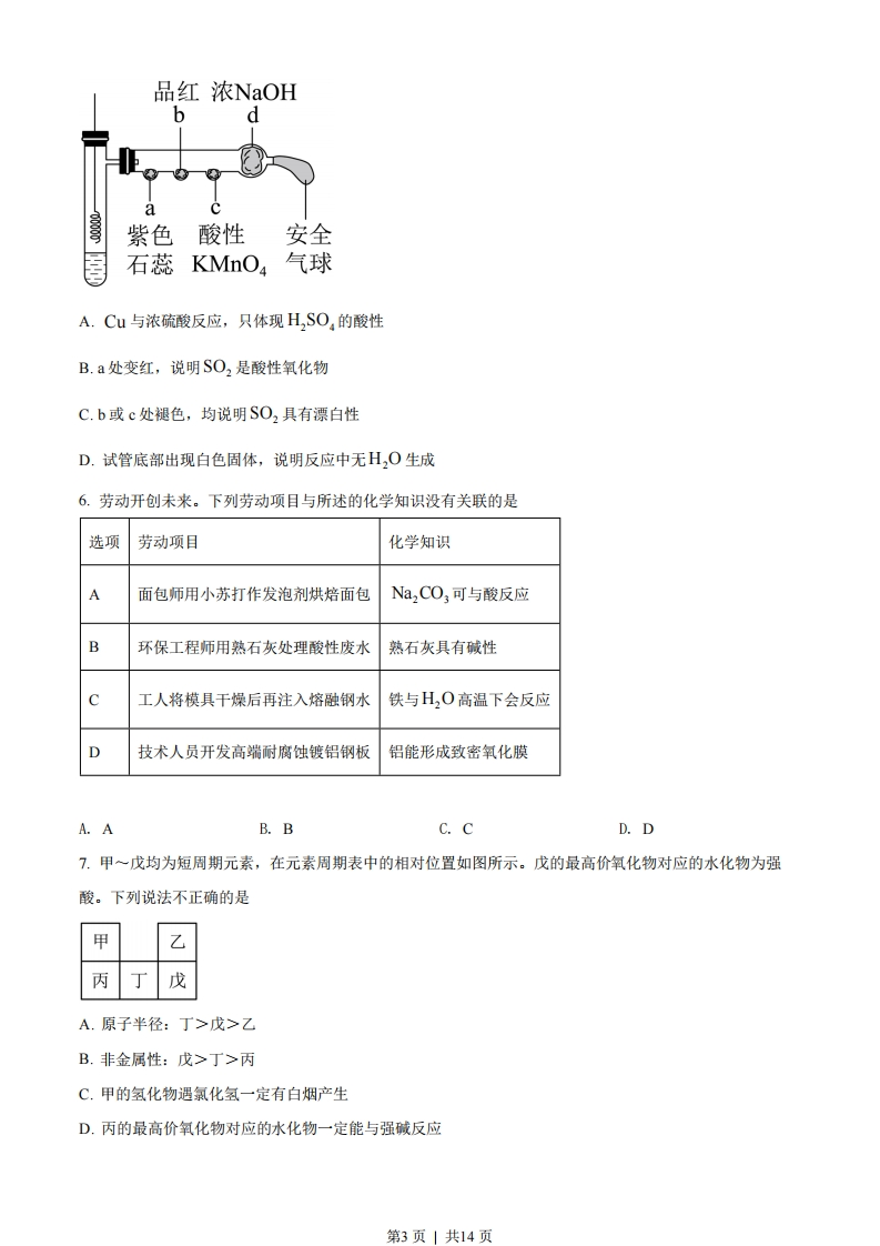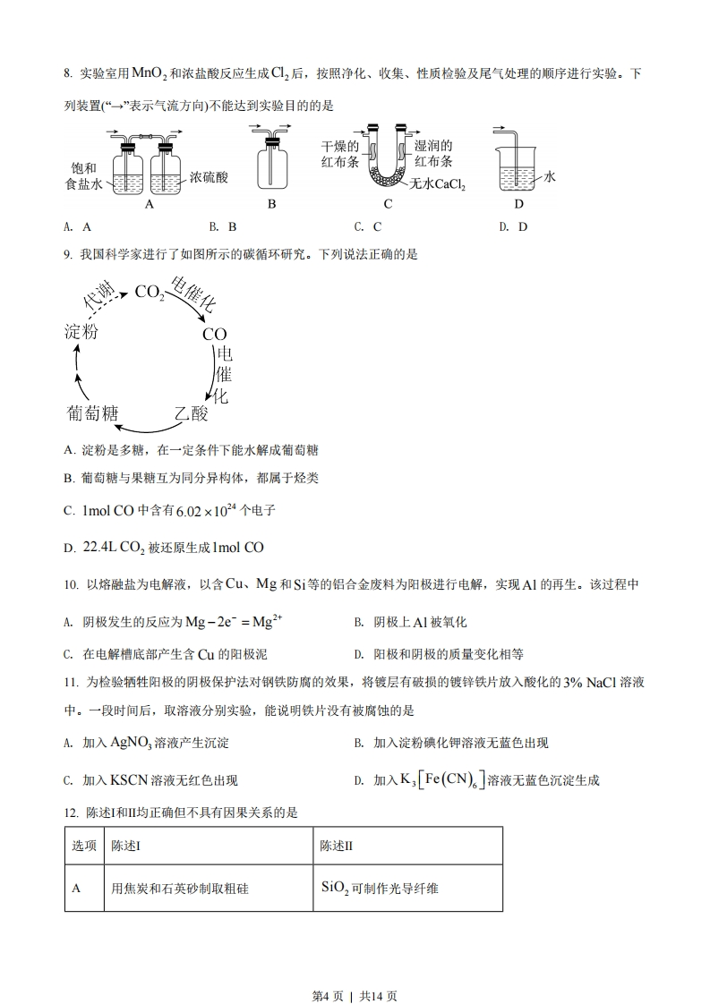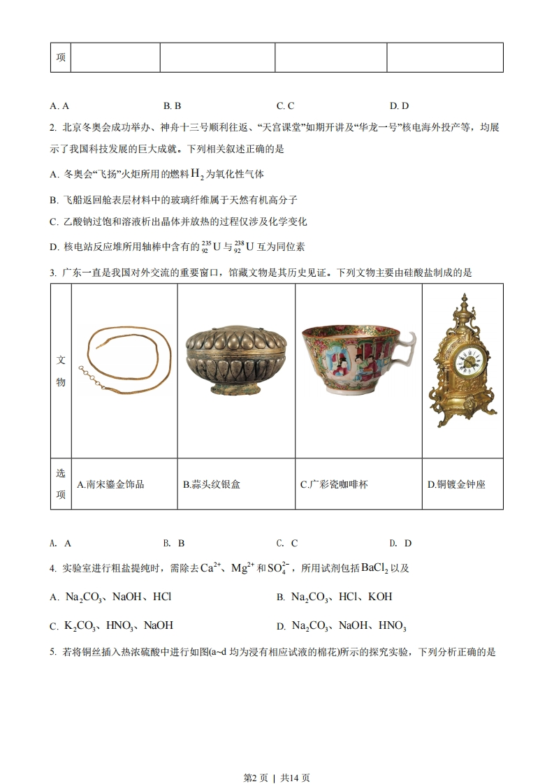 2022年广东省普通高中学业水平选择性考试化学本试卷共8页,21小题,满分100分,考试用时75分钟。注意事项:1答卷前,考生务必用黑色字迹钢笔或签字笔将自己的姓名、考生号、考场号和座位号填写在答题卡上。用2B铅笔将试卷类型(A)填涂在答题卡相应位置上。将条形码横贴在答题卡右上角“条形码粘贴处”。2.作答选择题时,选出每小题答案后,用2B铅笔把答题卡上对应题目选项的答案信息点涂黑;如需改动,用橡皮擦干净后,再选涂其他答案,答案不能答在试卷上。3.非选择题必须用黑色字迹钢笔或签字笔作答,答案必须写在答题卡各题目指定区域内相应位置上;如需改动,先划掉原来的答案,然后再写上新的答案;不准使用铅笔和涂改液。不按以上要求作答的答案无效。4.作答选考题时,请先用2B铅笔填涂选做题的题号对应的信息点,再作答。漏涂、错涂、多涂的,答案无效。5考生必须保持答题卡的整洁。考试结束后,将试卷和答题卡一并交回。可能用到的相对原子质量:H1C12N14016Na23Mg24S32C135.5Fe 56一、选择题:本题共16小题,共44分。第110小题,每小题2分;第1116小题,每小题4分。在每小题给出的四个选项中,只有一项是符合题目要求的。1.中华文明源远流长,在世界文明中独树一帜,汉字居功至伟。随着时代发展,汉字被不断赋子新的文化内涵,其载体也发生相应变化。下列汉字载体主要由合金材料制成的是大汉重黑wc警-周字秋山载千山惯五年携子不到故人体选A.兽骨B.青铜器C纸张D.液晶显示屏第1页」共14页项A.AB.BC.CD.D2.北京冬奥会成功举办、神舟十三号顺利往返、“天宫课堂”如期开讲及“华龙一号”核电海外投产等,均展示了我国科技发展的巨大成就。下列相关叙述正确的是A.冬奥会“飞扬”火炬所用的燃料H,为氧化性气体B.飞船返回舱表层材料中的玻璃纤维属于天然有机高分子C.乙酸钠过饱和溶液析出晶体并放热的过程仅涉及化学变化D.核电站反应堆所用轴棒中含有的5U与U互为同位素3.广东一直是我国对外交流的重要窗口,馆藏文物是其历史见证。下列文物主要由硅酸盐制成的是文物000选A.南宋婆金饰品B蒜头纹银盒C.广彩瓷咖啡杯D.铜镀金钟座项A.AB.BC.CD.D4.实验室进行粗盐提纯时,需除去Ca2、Mg2+和SO,所用试剂包括BaCl2以及A.Na,CO3、NaOH、HClB.Na,CO3、HCl、KOHc.K,CO3、HNO3、NaOHD.Na,CO,、NaOH、HNO35.若将铜丝插入热浓硫酸中进行如图(a~d均为浸有相应试液的棉花)所示的探究实验,下列分析正确的是第2页」共14页品红浓NaOHbd000紫色酸性安全石蕊KMnO4气球A.Cu与浓硫酸反应,只体现H,SO,的酸性B.a处变红,说明SO2是酸性氧化物C.b或c处褪色,均说明SO2具有漂白性D.试管底部出现白色固体,说明反应中无H,O生成6.劳动开创未来。下列劳动项目与所述的化学知识没有关联的是选项劳动项目化学知识A面包师用小苏打作发泡剂烘焙面包Na,CO3可与酸反应B环保工程师用熟石灰处理酸性废水熟石灰具有碱性C工人将模具干燥后再注入熔融钢水铁与H,O高温下会反应D技术人员开发高端耐腐蚀镀铝钢板铝能形成致密氧化膜A.AB.BC.CD.D7.甲一戊均为短周期元素,在元素周期表中的相对位置如图所示。戊的最高价氧化物对应的水化物为强酸。下列说法不正确的是甲乙丙丁戊A.原子半径:丁>戊>乙B.非金属性:戊>丁>丙C.甲的氢化物遇氯化氢一定有白烟产生D.丙的最高价氧化物对应的水化物一定能与强碱反应第3页1共14页