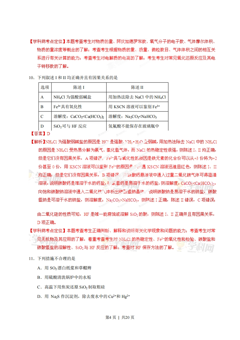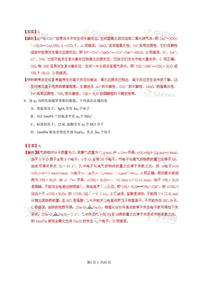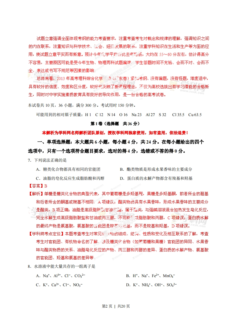 2013年普通高等学校招生全国究一考试(广东卷)埋科综心学试题学科网试卷总评、2013年普通高等学校招生全国统一考试(广东卷)理科综令化学试题,是广东省2010年开始以理科综合形式取代原有X科考试后第年的理科宗合化学试题,试题注重对基础知识、基本能力、基本方法和科学素养考查,加强对运用所学识分“题、解大新问题的能力的考查,试题依据大纲、紧靠课本,反映了《普通高中化学课程标准(实验)》的歡求,体现了普通高中新课程的理念,保证了试题的科学性、规范性和公平性,主面落实好:.两整方案的精神。试题的命制以《2013年普通高等学校水生充一考试理科杀合(化学科)考试大纲(课程标准实验版)》和《2013年普通高等学校招生统一试理科空台(化学利:考试大纲的说明》为依据,参考经全国中学教材审定季员会通过的三种版本的教材内容。针对考生学习水平差异大、考试时间短、学科间思维转换较多等现实情况,今年广东高考理综化学试题进行了科学设计、规划和安排,使试卷以容易题和中等难度题为主,试卷的阅读长度、作答时间和难度均适中,使试卷不仅具有选拔功能,也符合广东考生实际,考生考后对化学试题评价正面。.com试卷在题型结构、知识结构、能力结构等方面布局合理,保持了命题的稳定性与连续性,稳中有新意。化学考试内容覆盖5个专题内容,各专题内容此例符合考试说明要求,考点覆盖率约90,各知识能力要求符合考试大纲及说明。试题注重以真实材料为情境,关注$T$三的相互联系,将基础知识、技能与方法的考查和能力水平的考查交融于一体,运用能力考查模型,凸现能力立意,体现化学学科思想和方法以及新课程理念,令试题有好的信度和区分度。试题以能力立意,考查考生对化学基础知识、基本技能和方法的掌握情况,以及运用化学视角和所学知识分析、解决化学具体间题的能力和自主学习能力;试题注重理论联系实际,引导学生关注与化学有关的科学技术、社会经济和生态环境的协调发展,关注现实可题,重视对考生化学科学素养的全面考查,促进学生在知识与技能、过程与方法、情感态度和价值观等方面的全面发展。第1页|共20页式题立意强调全面体现考纲的能力考查要求,注重考查考生对慨念和规律的理解,强调知识之间的内在联系,注重知识与科学技术、4会、经:反展的联系,注重学科知识在生活和生产等方面的应用,使试题立意平实而有新意。预计今年学平均订比去年":低,大约在55~60分左右,估计得高分不容易,主要原因可能是受今年生物、物理两科试题偏戏,学生答题时间不充裕、会而不对、会而不全、表达或书写不规范等因素的影响总体来看,2013年高考理科综合化学,,东卷)紧考纲、没有偏题,没有怪题,难度适中,具有较好的信度、效度和区分度,较好"友映了新评程理念,不仅为高校选拔出有学习潜能的合格新生,同时对中学实施素质教育具有良好的导向作用,是一份合格的高考试卷。本试卷共10页,36小题,满分300分。考试用时150分钟。可能用到的相对原子质量:H1C12N14O16Na23A127S32C135.5Cu63.5第I卷(选择题共36分)本解析为学科网名师解析团队原创,授权学科网独家使用,如有盗用,依法追责!一、单项选择题:本大题共6小题,每小题4分,共24分。在每小题给出的四个选项中,只有一个选项符合题目要求,选对的得4分,选错或不答的得0分。7.下列说法正确的是A.糖类化合物都具有相同的官能团B.酯类物质是形成水果香味的主要成分C.油脂的皂化反应生成脂肪酸和丙醇D.蛋白质的水解产物都含有羧基和羟基【答案】B【解析】单糖是糖类化合物的典型代表,其中葡萄糖是多羟基程,果糖是多羟基酮,前者所含的醛基和后者所含的酮基或羰基不相同:A项错识:酯类物贞具有水果香味,形成水果香味的主要成分是酯类,B项正确:油脂是高级脂肿<甘油三二,属于英,与强碱溶液混合加热发生皂化反应,完全水解生成高级脂肪酸盐和甘油或丙三醇,不可能成脂肪酸和丙醇,C项错误:蛋白质水解的最终产物是氨基酸,氨基酸的店能团是羚基,而不是羧基和羟基,D项错误。【学科网考点定位】本题考查考生对常见物的组成、宪、性质和变化及相互联系的了解,考查考生对官能团、有机物命名的了解.及糖类抄合物(如芦萄糖和果糖)官能团的异同、水果香味与酯类物质的关系、油脂皂化反应的产物、丙三醇和丙醇的差异、蛋白质的水解产物、氨基酸的官能团、羟基和氨基的差异等8.水溶液中能大量共存的一组离子是A.Na、A3t、C-、CO32B.Ht、Nat、Fe2+、MnOC.K、Ca2+、C-、NO3D.Kt、NHt、OH-、SOa2-第2页|共20页【答案】C【解析】A1与C0:2容易在水中发生双水解反应,生成氢氧化铝沉淀和二氧化碳气体,即2A1*+3C0:ˉ→3H0==2A1(OH:→3C02↑,A项错误;0:ˉ具有强氧化性,Fe2具有还原性,它们在酸性溶液中容易发生氧化还原反应,即8H→Fe+nO:==Fe3+n+4HO,B项错误,K*、Ca2*C1ˉ、O:之间不能发生复分解反应和氧化还原反应,因此它们在水中能大量共存,C项正确:NH:和OH容易发生复分解反应,生成一水合氨或者氨气和水,即NH:+OH“=NH·H:O或NH↑+H,O,D项错误.【学科网考点定位】考查考生对离子反应的概念、氧化还原反应概念、离子反应发生条件的了解,以及对常见离子性质的掌握程度。主要涉及A1的水解性、C0:2的水解性、MO:的强氧化性、Fe2具有还原性、NH的水解性、H:·H0的弱碱性和不稳定性等。9.设n为阿伏加德