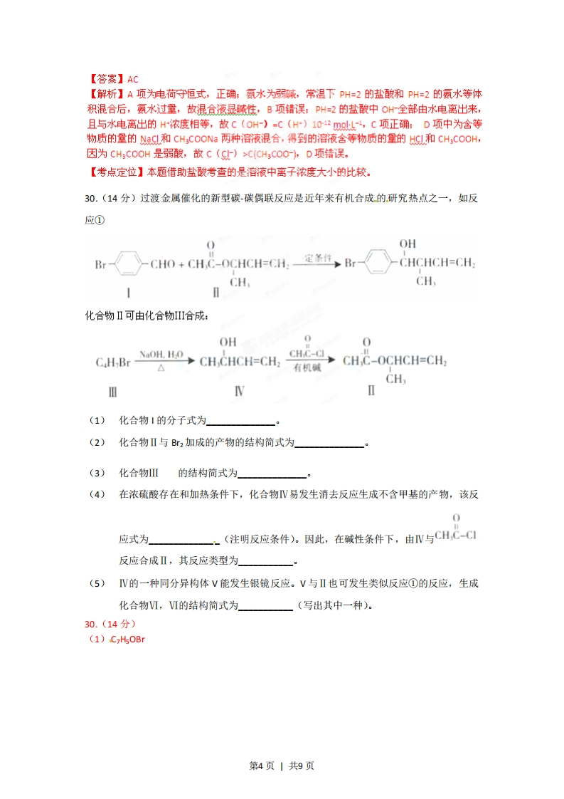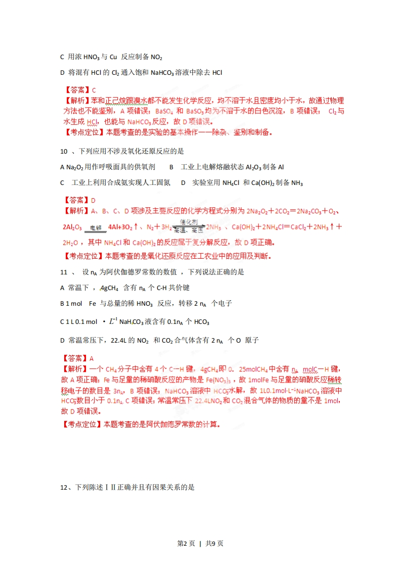 2012年广东高考理综化学部分试卷解析教师版【试卷总评】2012年广东高考理综卷化学部分,遵循考纲要求,稳中求变,重点考查了元素及其化合物的性质、实验探究和实验的基本操作知识,意在考查学生的实验探究能力的考查和信息获取与应用能力的考查。试卷知识点考查全面,选择题考查的比较基础,主要包括了化学与生活知识、高分子材料,离子共存,阿伏伽德罗常数大题考查的了化学实验及现象分析,有机合成,化学反应速率与化学平衡知识和物质制备的流程图,难度增大,提高试卷的区分度。【试题解析】7、化学与生活息息相关,下列说法不正确的是A用食醋可除去热水壶内壁的水垢B淀粉,油脂和蛋白质都是高分子化合物C自行车钢价生锈主要是电化学腐蚀所致D新型复合材料使用手机,电脑能电子产品更轻巧,使用和新潮【答案】B【解析】食醋和水垢的主要成分分别是酯酸和碳酸钙,醋酸的酸性强于碳酸,可以利用两者反应而除去水垢,A项正确:油脂是高级脂肪酸和甘油反应形成的酯,不是高分子化合物,B项错误:自然界金属腐蚀以电化学腐蚀为主,C项正确.【考点定位】本题考查的是化学在生活中的应用.8、在水溶液中能大量共存的一组是A Fe2 Al*CIO Cr B K*Cu OH-NOC NH.Na Br.SOD Mg2+H+SiO SO【答案】c【解析】Cg能氧化Fe2,故A项错误Cu2与OH生Cu(OH):沉淀而不能大量共存,B项错误;H*与SO3能生成H:SiO白色沉淀而不能大量共存,D项错误。【考点定位】本题考查的是离子在溶液中的共存问题。9下列实验能达到目的的是A用溴水鉴别苯和乙烷B用BaC2溶液鉴别SO2-和SO第1页1共9页C用浓HNO3与Cu反应制备NO2D将混有HCI的C2通入饱和NaHCO3溶液中除去HC【答案】c【解析】苯和正己烷跟溴水都不能发生化学反应,均不溶于水且密度均小于水,故通过物理方法也不能鉴别,A项错误,BaS0:和BaSO,均为不溶于水的白色沉淀,B项错误,Cl2与水生成HC,也能与NaHCO反应,故D项错误,【考点定位】本题考查的是实验的基本操作一一除杂、鉴别和制备。10、下列应用不涉及氧化还原反应的是AN2O2用作呼吸面具的供氧剂B工业上电解熔融状态AlO3制备AlC工业上利用合成氨实现人工固氮D实验室用NHaCl和Ca(OHh制备NH3【答案】D【解析】A、B、C、D项涉及主要反应的化学方程式分别为2Naz02十2C02=2NazC03十O2值化剂2Al:0电a4Al430:↑、N:+3H:.图起2NH,、CaOH:+2NH:C=CaC4+2NH↑+2H,0,其中NHC1和Ca(OH2的反应属于复分解反应,故D项正确.【考点定位】本题考查的是氧化还原反应在工农业中的应用及断。11、设na为阿伏伽德罗常数的数值,下列说法正确的是A常温下,4gCH4含有na个C-H共价键B1 mol Fe与总量的稀HNO3反应,转移2na个电子c1L0.1mol·L NaH.C03液含有0.1na个HC03D常温常压下,22.4L的NO2和C02合气体含有2na个0原子【答案】A【解析】一个CH4分子中含有4个C-H键,4gCH:即0.25 molCH:.中含有ameg一H键,故A项正确,e与足量的稀硝酸反应的产物是FeNO3,故1 molFe与足量的硝酸反应稀转移电子的数目是3na,B项错误;NaHCO,溶液中HCC水解,故1LO.1mclL-NaHCO,溶液中HCC数目小于0.1naC项错误;常温常压下22.4LNO2和c02混合气体的物质的量不是1mol,故D项错误。【考点定位】本题考查的是阿伏加德罗常数的计算.12、下列陈述IⅡ正确并且有因果关系的是第2页1共9页选项陈述陈述S0,有漂白性S0可使溴水褪色BSi0有导电性S0,可用于制备光导纤维C浓硫酸有强氧化性浓硫酸可用于于燥H,和CODFe有氧化性FCl,溶液可用于问收废旧电路板中的铜【答案】D【解析】S02使溴水褪色是由于S02的还原性,A项错误,Si02不导电,B项陈述1错误,浓硫酸做干燥剂是利用了浓硫酸的吸水性,C项错误,Fcl,溶液用于回收废旧电路板中的铜是利用了反应:2e3++Cu=2Fe24+Cu2+,D项正确.【考点定位】本题考查的是元素及其化合物的性质。22.图7是部分周期元素化合价与原子序数的关系图,下列说法正确的是原子序数图7A.原子半径:Z>Y>XB.气态氢化物的稳定性:R>WC.WX3和水反应形成的化合物是离子化合物D.Y和Z两者最高价氧化物对应的水化物能相互反应【答案】BD【解析】由图可知,X只有2价,且X、Y、Z、W、R原子序数依次增大,故X、Y、Z、WR依次为O、Na、A、S、.原子半径为Na>AO,A项错误,氧化性:CS,故稳定性:HCHS,B项正确,SO,和水反应形成的化合物是硫酸,属于共价化合物,C项错误;NaQ以和Al(OH能发生反应生成NaAO2和水,D项正确。【考点定位】本题考查的是元素周期表中的元素推断及物质的性质判断。23.对于常温下pH为2的盐酸,叙述正确的是A.c (H+)=c (Ch)+c (OH)B.与等体积pH=12的氨水混合后所得溶液显酸性C.由H20电离出的c(H+)=1.0×1012mol·L1D.与等体积0.01mol·L1乙酸钠溶液混合后所得溶液中:c(C)=C(CHCO0)第3页1共9页
