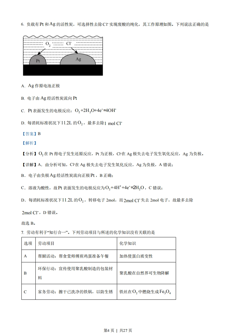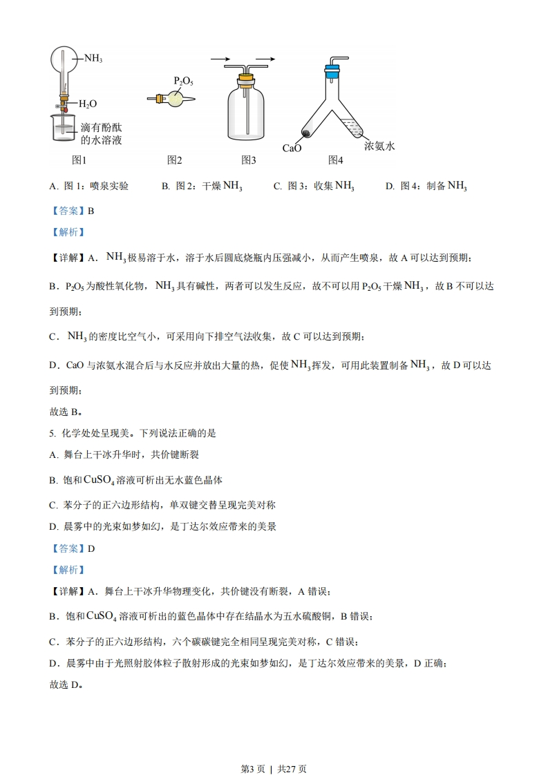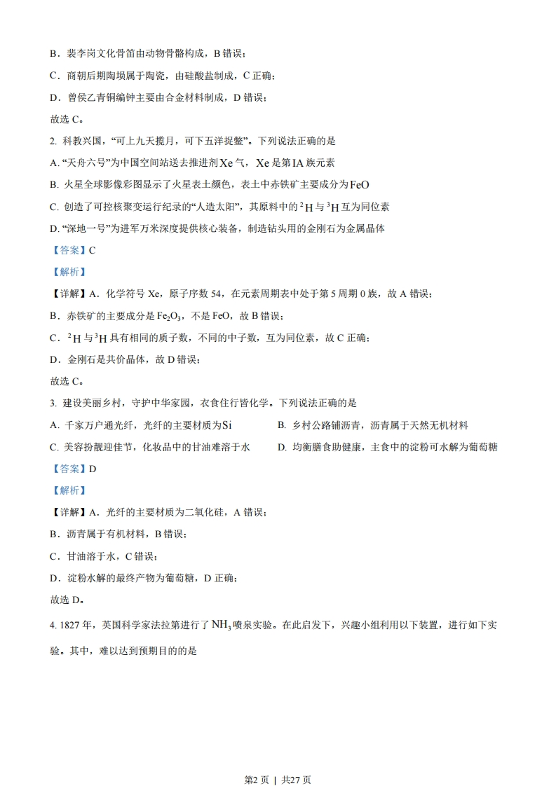 2023年广东省普通高中学业水平选择性考试化学满分100分,考试用时75分钟注意事项:1答卷前,考生务必用黑色字迹钢笔或签字笔将自己的姓名、考生号、考场号和座位号填写在答题卡上。用2B铅笔将试卷类型(B)填涂在答题卡相应位置上。将条形码横贴在答题卡右上角“条形码粘贴处”。2.作答选择题时,选出每小题答案后,用2B铅笔把答题卡上对应题目选项的答案信息点涂黑:如需改动,用橡皮擦干净后,再选涂其他答案,答案不能答在试卷上。3.非选择题必须用黑色字迹钢笔或签字笔作答,答案必须写在答题卡各题目指定区域内相应位置上:如需改动,先划掉原来的答案,然后再写上新的答案,不准使用铅笔和涂改液。不按以上要求作答的答案无效。4.考生必须保持答题卡的整洁。考试结束后,将试卷和答题卡一并交回。可能用到的相对原子质量:H-1C-12N-140-16S-32C1-35.5Fe-56Cu-64Zn-65一、选择题:本题共16小题,共44分。第110小题,每小题2分;第11~16小题,每小题4分。在每小题给出的四个选项中,只有一项是符合题目要求的。1.“高山流水觅知音”。下列中国古乐器中,主要由硅酸盐材料制成的是A.九霄环佩木B.裴李岗文化D.曾侯乙青铜编C.商朝后期陶埙古琴骨笛钟A.AB.BC.CD.D【答案】C【解析】【详解】A.九霄环佩木古琴主要构成是木材,动物筋制得,A错误:第1页」共27页B.裴李岗文化骨笛由动物骨骼构成,B错误:C,商朝后期陶埙属于陶瓷,由硅酸盐制成,C正确:D.曾侯乙青铜编钟主要由合金材料制成,D错误:故选C。2.科教兴国,“可上九天揽月,可下五洋捉鳖”。下列说法正确的是A.“天舟六号”为中国空间站送去推进剂Xe气,Xe是第IA族元素B.火星全球影像彩图显示了火星表土颜色,表土中赤铁矿主要成分为FOC.创造了可控核聚变运行纪录的“人造太阳”,其原料中的2H与3H互为同位素D.“深地一号”为进军万米深度提供核心装备,制造钻头用的金刚石为金属晶体【答案】C【解析】【详解】A.化学符号X©,原子序数54,在元素周期表中处于第5周期0族,故A错误:B.赤铁矿的主要成分是FeO3,不是FcO,故B错误:C.2H与3H具有相同的质子数,不同的中子数,互为同位素,故C正确:D.金刚石是共价晶体,故D错误:故选C。3.建设美丽乡村,守护中华家园,衣食住行皆化学。下列说法正确的是A.千家万户通光纤,光纤的主要材质为SiB.乡村公路铺沥青,沥青属于天然无机材料C.美容扮靓迎佳节,化妆品中的甘油难溶于水D.均衡蘑食助健康,主食中的淀粉可水解为葡萄糖【答案】D【解析】【详解】A.光纤的主要材质为二氧化硅,A错误:B.沥青属于有机材料,B错误:C.甘油溶于水,C错误:D.淀粉水解的最终产物为葡萄糖,D正确:故选D。4.1827年,英国科学家法拉第进行了NH喷泉实验。在此启发下,兴趣小组利用以下装置,进行如下实验。其中,难以达到预期目的的是第2页」共27页NH】-H2O滴有酚酞的水溶液CaO浓氨水图1图2图3图4A.图1:喷泉实验B.图2:干燥NH3C.图3:收集NHD.图4:制备NH【答案】B【解析】【详解】A.NH极易溶于水,溶于水后圆底烧瓶内压强减小,从而产生喷泉,故A可以达到预期:B.PO5为酸性氧化物,NH3具有碱性,两者可以发生反应,故不可以用P2O5干燥NH3,故B不可以达到预期:C.H3的密度比空气小,可采用向下排空气法收集,故C可以达到预期:D.CO与浓氨水混合后与水反应并放出大量的热,促使NH挥发,可用此装置制备NH3,故D可以达到预期:故选B。5.化学处处呈现美。下列说法正确的是A.舞台上干冰升华时,共价键断裂B.饱和CuSO,溶液可析出无水蓝色晶体C.苯分子的正六边形结构,单双键交替呈现完美对称D.晨雾中的光束如梦如幻,是丁达尔效应带来的美景【答案】D【解析】【详解】A.舞台上干冰升华物理变化,共价键没有断裂,A错误:B.饱和CuSO,溶液可析出的蓝色晶体中存在结晶水为五水硫酸铜,B错误:C.苯分子的正六边形结构,六个碳碳键完全相同呈现完美对称,C错误:D.晨雾中由于光照射胶体粒子散射形成的光束如梦如幻,是丁达尔效应带来的美景,D正确:故选D。第3页」共27页
