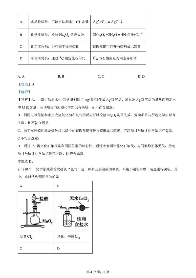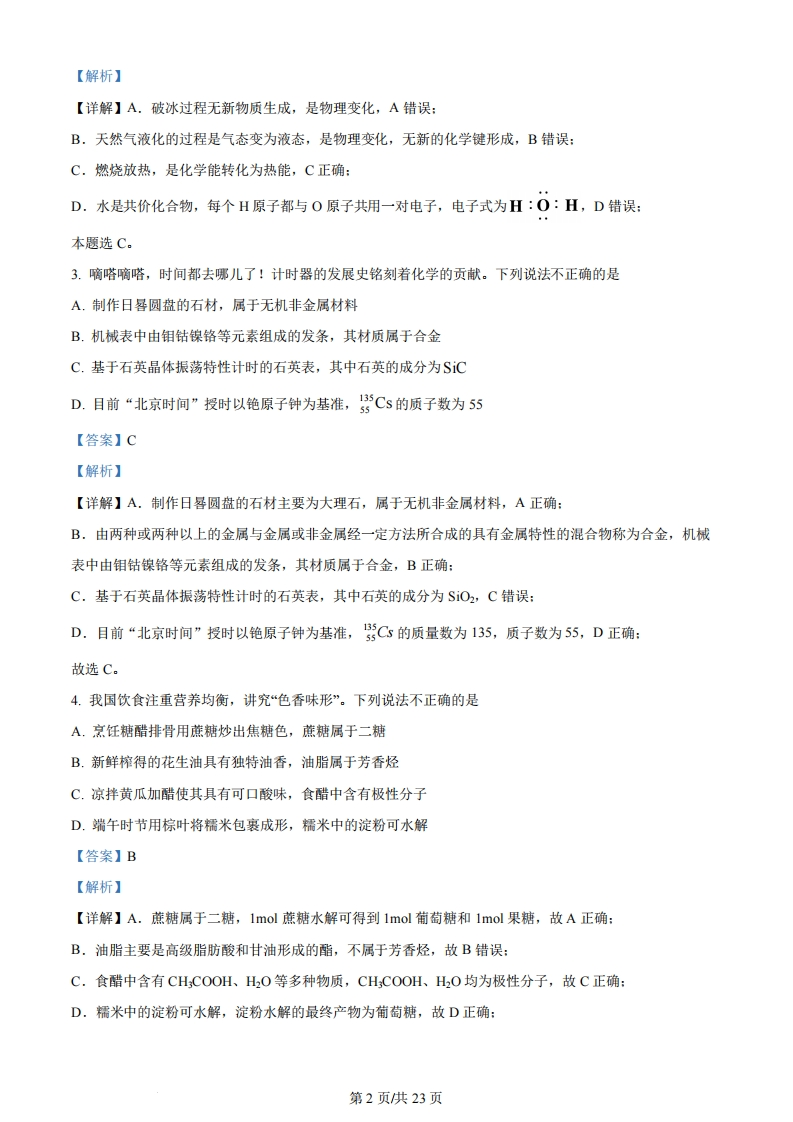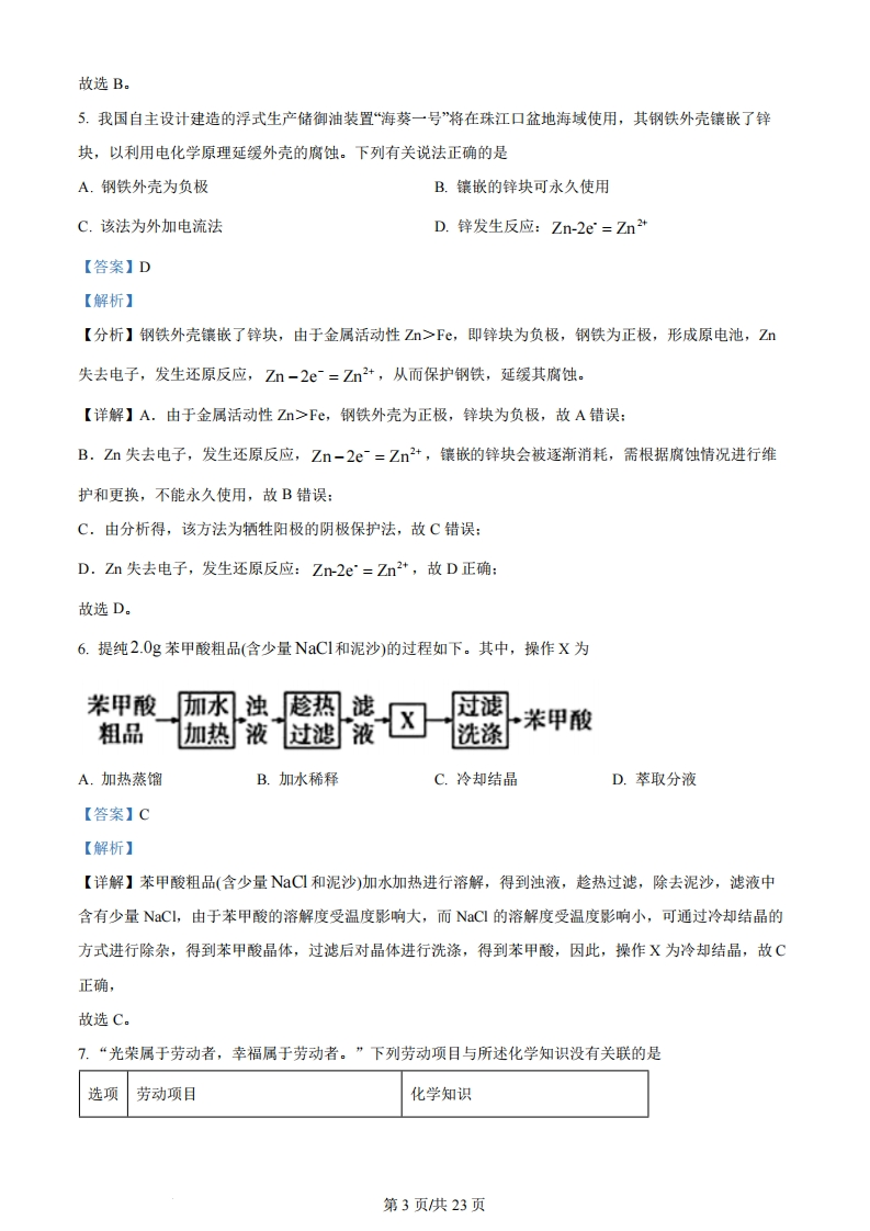 2024年普通高中学业水平选择性考试(广东卷)化学本卷满分100分,考试用时75分钟。可能用到的相对原子质量:H1C12016Na23S32C135.5Ca40Fe56一、选释题:本大题共16小题,共44分。第1-题,每小题2分;第11-16小题,每小题4分。在每小题列出的四个选项中,只有一项符合题目要求。1.龙是中华民族重要的精神象征和文化符号。下列与龙有关的历史文物中,主要材质为有机高分子的是婆金铁芯铜云龙纹瓷红山玉龙云龙纹丝绸龙瓶A.AB.BC.CD.D【答案】C【解析】【详解】A.红山玉龙主要成分为SO2和硅酸盐,属于无机非金属材料,A不符合题意:B.婆金铁芯铜龙主要成分为Cu,属于金属材料,B不符合题意:C.云龙纹丝绸主要成分为蛋白质,属于有机高分子材料,C符合题意:D.云龙纹瓷瓶主要成分为硅酸盐,属于传统无机非金属材料,D不符合题意:故选C。2.“极地破冰”“太空养鱼”等彰显了我国科技发展的巨大成就。下列说法正确的是A.“雪龙2”号破冰船极地科考:破冰过程中水发生了化学变化B.大型液化天然气运输船成功建造:天然气液化过程中形成了新的化学键C.嫦娥六号的运载火箭助推器采用液氧煤油发动机:燃烧时存在化学能转化为热能D.神舟十八号乘组带着水和斑马鱼进入空间站进行科学实验:水的电子式为H:O:H【答案】C第1页供23页【解析】【详解】A.破冰过程无新物质生成,是物理变化,A错误:B.天然气液化的过程是气态变为液态,是物理变化,无新的化学键形成,B错误:C.燃烧放热,是化学能转化为热能,C正确:D.水是共价化合物,每个H原子都与O原子共用一对电子,电子式为H:O:H,D错误:本题选C。3.嘀嗒嘀嗒,时间都去哪儿了!计时器的发展史铭刻着化学的贡献。下列说法不正确的是A.制作日晷圆盘的石材,属于无机非金属材料B.机械表中由钼钴镍铬等元素组成的发条,其材质属于合金C.基于石英晶体振荡特性计时的石英表,其中石英的成分为SCD.目前“北京时间”授时以铯原子钟为基准,Cs的质子数为55【答案】C【解析】【详解】A.制作日晷圆盘的石材主要为大理石,属于无机非金属材料,A正确:B.由两种或两种以上的金属与金属或非金属经一定方法所合成的具有金属特性的混合物称为合金,机械表中由钼钴镍铬等元素组成的发条,其材质属于合金,B正确:C.基于石英晶体振荡特性计时的石英表,其中石英的成分为SO2,C错误:D.目前“北京时间”授时以铯原子钟为基准,Cs的质量数为135,质子数为55,D正确:故选C。4.我国饮食注重营养均衡,讲究“色香味形”。下列说法不正确的是A.烹饪糖醋排骨用蔗糖炒出焦糖色,蔗糖属于二糖B.新鲜榨得的花生油具有独特油香,油脂属于芳香烃C.凉拌黄瓜加醋使其具有可口酸味,食醋中含有极性分子D.端午时节用棕叶将糯米包裹成形,糯米中的淀粉可水解【答案】B【解析】【详解】A.蔗糖属于二糖,1mol蔗糖水解可得到1mol葡萄糖和1mol果糖,故A正确:B.油脂主要是高级脂肪酸和甘油形成的酯,不属于芳香烃,故B错误:C.食醋中含有CH;COOH、H2O等多种物质,CH;COOH、H2O均为极性分子,故C正确:D.糯米中的淀粉可水解,淀粉水解的最终产物为葡萄糖,故D正确:第2页供23页故选B。5.我国自主设计建造的浮式生产储御油装置“海葵一号”将在珠江口盆地海域使用,其钢铁外壳镶嵌了锌块,以利用电化学原理延缓外壳的腐蚀。下列有关说法正确的是A.钢铁外壳为负极B.镶嵌的锌块可永久使用C.该法为外加电流法D.锌发生反应:Zn-2e=Zn2+【答案】D【解析】【分析】钢铁外壳镶嵌了锌块,由于金属活动性Zn>Fe,即锌块为负极,钢铁为正极,形成原电池,Zn失去电子,发生还原反应,Zn-2e=Z2+,从而保护钢铁,延缓其腐蚀。【详解】A.由于金属活动性Zn>Fe,钢铁外壳为正极,锌块为负极,故A错误:B.Zn失去电子,发生还原反应,Zn-2e=Zn+,镶嵌的锌块会被逐渐消耗,需根据腐蚀情况进行维护和更换,不能永久使用,故B错误:C.由分析得,该方法为牺牲阳极的阴极保护法,故C错误:D.Zn失去电子,发生还原反应:Zn-2e=Zn2+,故D正确:故选D。6.提纯2.0g苯甲酸粗品(含少量NaCl和泥沙)的过程如下。其中,操作X为苯甲酸加水浊趁热过滤粗品加热过滤选涤苯甲酸A.加热蒸馏B.加水稀释C.冷却结晶D.萃取分液【答案】C【解析】【详解】苯甲酸粗品(含少量NCI和泥沙)加水加热进行溶解,得到浊液,趁热过滤,除去泥沙,滤液中含有少量NaCl,由于苯甲酸的溶解度受温度影响大,而NaC的溶解度受温度影响小,可通过冷却结晶的方式进行除杂,得到苯甲酸晶体,过滤后对晶体进行洗涤,得到苯甲酸,因此,操作X为冷却结晶,故C正确,故选C。7.“光荣属于劳动者,幸福属于劳动者。”下列劳动项目与所述化学知识没有关联的是选项劳动项目化学知识第3页供23页