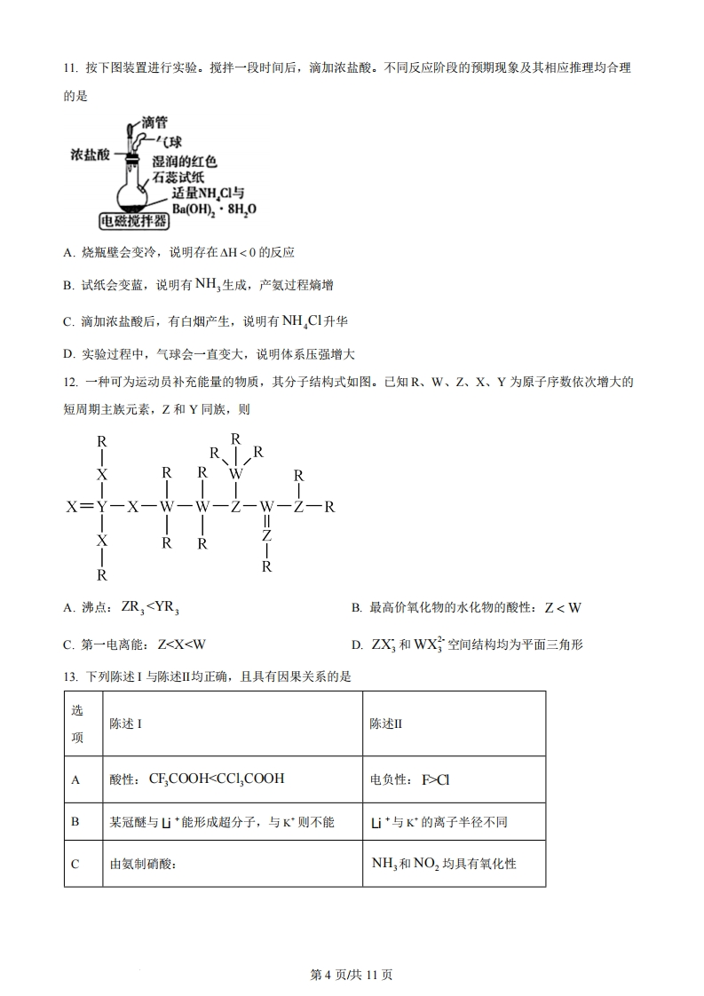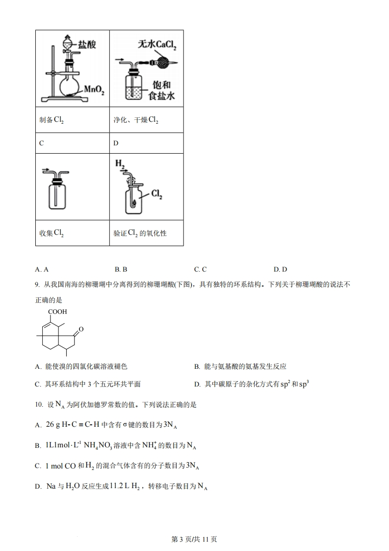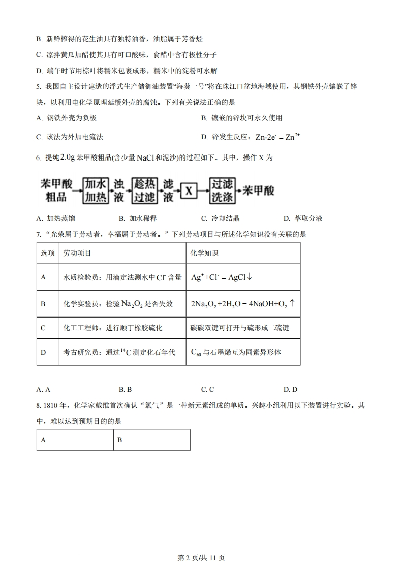 2024年普通高中学业水平选择性考试(广东卷)化学本卷满分100分,考试用时75分钟。可能用到的相对原子质量:H1C12016Na23S32C135.5Ca40Fe56一、选择题:本大题共16小题,共44分。第1-题,每小题2分;第11-16小题,每小题4分。在每小题列出的四个选项中,只有一项符合题目要求。1.龙是中华民族重要的精神象征和文化符号。下列与龙有关的历史文物中,主要材质为有机高分子的是婆金铁芯铜云龙纹瓷红山玉龙云龙纹丝绸龙瓶A.AB.BC.CD.D2.“极地破冰”“太空养鱼”等彰显了我国科技发展的巨大成就。下列说法正确的是A.“雪龙2”号破冰船极地科考:破冰过程中水发生了化学变化B.大型液化天然气运输船成功建造:天然气液化过程中形成了新的化学键C.嫦娥六号的运载火箭助推器采用液氧煤油发动机:燃烧时存在化学能转化为热能D.神舟十八号乘组带着水和斑马鱼进入空间站进行科学实验:水的电子式为H:O:H3.嘀嗒嘀嗒,时间都去哪儿了!计时器的发展史铭刻着化学的贡献。下列说法不正确的是A.制作日晷圆盘的石材,属于无机非金属材料B.机械表中由钼钴镍铬等元素组成的发条,其材质属于合金C.基于石英晶体振荡特性计时的石英表,其中石英的成分为SCD.目前“北京时间”授时以铯原子钟为基准,Cs的质子数为554.我国饮食注重营养均衡,讲究“色香味形”。下列说法不正确的是A.烹饪糖醋排骨用蔗糖炒出焦糖色,蔗糖属于二糖第1页供11页B.新鲜榨得的花生油具有独特油香,油脂属于芳香烃C.凉拌黄瓜加醋使其具有可口酸味,食醋中含有极性分子D.端午时节用棕叶将糯米包裹成形,糯米中的淀粉可水解5.我国自主设计建造的浮式生产储御油装置“海葵一号”将在珠江口盆地海域使用,其钢铁外壳镶嵌了锌块,以利用电化学原理延缓外壳的腐蚀。下列有关说法正确的是A.钢铁外壳为负极B.镶嵌的锌块可永久使用C.该法为外加电流法D.锌发生反应:Zn-2e=Zn2+6.提纯2.0g苯甲酸粗品(含少量NaCI和泥沙)的过程如下。其中,操作X为苯甲酸加水浊趁热滤过滤粗品加热液过滤液选涤苯甲酸A.加热蒸馏B.加水稀释C.冷却结晶D.萃取分液7.“光荣属于劳动者,幸福属于劳动者。”下列劳动项目与所述化学知识没有关联的是选项劳动项目化学知识A水质检验员:用滴定法测水中C含量Ag"+CI=AgCI化学实验员:检验Na2O2是否失效2Na,02+2H,0=4NaOH+0,↑化工工程师:进行顺丁橡胶硫化碳碳双键可打开与硫形成二硫键考古研究员:通过1“C测定化石年代C0与石墨烯互为同素异形体A.AB.BC.CD.D8.1810年,化学家戴维首次确认“氯气”是一种新元素组成的单质。兴趣小组利用以下装置进行实验。其中,难以达到预期目的的是AB第2页供11页盐酸无水CaClMno.饱和食盐水制备Cl2净化、干燥C2C0收集C验证C2的氧化性A.AB.BC.CD.D9.从我国南海的柳珊瑚中分离得到的柳珊瑚酸(下图),具有独特的环系结构。下列关于柳珊瑚酸的说法不正确的是COOHA.能使溴的四氯化碳溶液褪色B.能与氨基酸的氨基发生反应C.其环系结构中3个五元环共平面D.其中碳原子的杂化方式有Sp和sp10.设N。为阿伏加德罗常数的值。下列说法正确的是A.26gH-C=C-H中含有c键的数目为3NAB.1LImol.L NH,NO,溶液中含NH的数目为NC.1 mol CO和H,的混合气体含有的分子数目为3ND.Na与HO反应生成11.2LH2,转移电子数目为N第3页供11页
