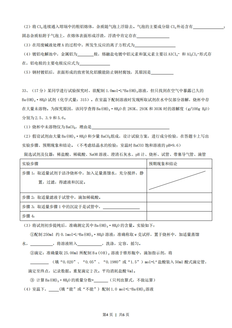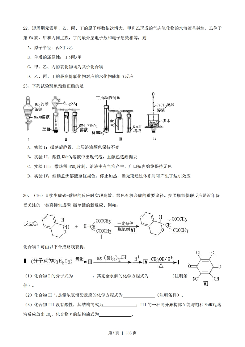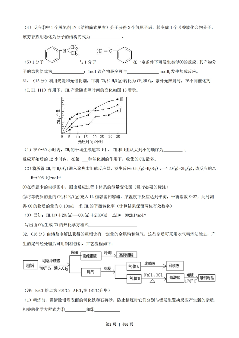 2011年广东化学试题一、单选题7.下列说法正确的是A.纤维素和淀粉遇碘水均显蓝色B.蛋白质、乙酸和葡萄糖均属电解质C.溴乙烷与NaOH乙醇溶液共热生成乙烯D.乙酸乙酯和食用植物油均可水解生成乙醇8.能在水溶液中大量共存的一组离子是A.H+、I-、N02、Si02B.Ag+、Fea+、Cl-、S02-C.K+、S0,2-、Cu2+、N02D.NH+、OH-、C1-、HC029.设n为阿伏伽德罗常数的数值,下列说法正确的是A、常温下,23gNO2含有n,个氧原子B、1L0.1molL-1的氨水含有0.1n,个0HC、常温常压下,22.4LCC1,含有个nCC1,分子D、1 molFe2*与足量的H02溶液反应,转移2n,个电子10、某同学通过系列实验探究Mg及其化合物的性质,操作正确且能达到目的的是A、将水加入浓硫酸中得到稀硫酸,置镁条于其中探究Mg的活泼性B、将NaOH溶液缓慢滴入MgSO,溶液中,观察Mg(OH)z沉淀的生成C、将Mg(OH)z浊液直接倒入己装好滤纸的漏斗中过滤,洗涤并收集沉淀D、将Mg(OH)z沉淀转入蒸发皿中,加足量稀盐酸,加热蒸干得无水MgC12固体11、对于0.1molL-NaS02溶液,正确的是A、升高温度,溶液的pH降低B、c(Na+)=2c(S02-)+c(HS02-)+c(HS03)C、c(Na+)+c(Ht)=2c(S02-)+2c(HS0)+c(OH-)D、加入少量NaOH固体,c(SO,-)与c(Na+)均增大12、某小组为研究电化学原理,设计如图2装置。下列叙述不正确的是A、a和b不连接时,铁片上会有金属铜析出B、a和b用导线连接时,铜片上发生的反应为:Cu2+2e=CuC、无论a和b是否连接,铁片均会溶解,溶液从蓝色逐渐变成浅绿色D、a和b分别连接直流电源正、负极,电压足够大时,Cu2+向铜电极移动S04图2第1页1共6页22、短周期元素甲、乙、丙、丁的原子序数依次增大,甲和乙形成的气态氢化物的水溶液呈碱性,乙位于第VA族,甲和丙同主族,丁的最外层电子数和电子层数相等,则A、原子半径:丙>丁)乙B、单质的还原性:丁>丙>甲C、甲、乙、丙的氧化物均为共价化合物D、乙、丙、丁的最高价氧化物对应的水化物能相互反应23、下列试验现象预测正确的是可抽动的铜丝Bx的苯浓H2S04FeC13饱和溶液溶液NaOH溶液沸水酸性Kn0NaOH溶液稀N05溶液IMIWA、实验I:振荡后静置,上层溶液颜色保持不变B、实验II:酸性KO,溶液中出现气泡,且颜色逐渐褪去C、实验III:微热稀NO,片刻,溶液中有气泡产生,广口瓶内始终保持无色D、实验IV:继续煮沸溶液至红褐色,停止加热,当光束通过体系时可产生丁达尔效应30、(16)直接生成碳-碳键的反应时实现高效、绿色有机合成的重要途径。交叉脱氢偶联反应是近年备受关注的一类直接生成碳-碳单键的新反应。例如:COOCH3COOCH3反应①:+H-CH一定条件CHCoOCH3脱氢剂ⅥCOOCH3I化合物I可由以下合成路线获得:Ⅱ(分子式为03Hg2)氧化Ⅲ怒0g)20、其WC0H/时(1)化合物I的分子式为其完全水解的化学方程式为(注明条NOCN件)。(2)化合物I与足量浓氢溴酸反应的化学方程式为(注明条件)。(3)化合物III没有酸性,其结构简式为:III的一种同分异构体V能与饱和NaHCO2.溶液反应放出CO2,化合物V的结构简式为第2页1共6页(4)反应①中1个脱氢剂IV(结构简式见右)分子获得2个氢原子后,转变成1个芳香族化合物分子,该芳香族胡恶化为分子的结构简式为CH3CH3HC≡(5)1分子与1分子在一定条件下可发生类似①的反应,其产物分子的结构简式为:1mo1该产物最多可与molH2发生加成反应。31、(15分)利用光能和光催化剂,可将C02和H0(g)转化为CH,和02。紫外光照射时,在不同催化剂(I,II,III)作用下,CH,产量随光照时间的变化如图13所示。05101520253035光照时间/小时(1)在0-30小时内,CH,的平均生成速率VI、I和从大到小的顺序为反应开始后的12小时内,在第种催化剂的作用下,收集的CH最多。(2)将所得CH与H0(g)通入聚焦太阳能反应器,发生反应CH,(g)+H0(g)亡C0(g)+3H2(g),该反应的△H=+206kJ·mo1-H①在答题卡的坐标图中,画出反应过程中体系的能量变化图(进行必要的标注)②将等物质的量的CH,和H0(g)充入1L恒容密闭容器,某温度下反应达到平衡,平衡常数K=27,此时测得C0的物质的量为0.10mo1,求CH,的平衡转化率(计算结果保留两位有效数字)(3)己知:CH,(g)+202(g)C02(g)+2H0(g)△H=-802kJ·mo1-写出由C02生成C0的热化学方程式32.(16分)由熔盐电解法获得的粗铝含有一定量的金属钠和氢气,这些杂质可采用吹气精炼法除去,产生的尾气经处理后可用钢材镀铝。工艺流程如下:除渣冷却高纯铝液高纯铝锭坩埚中精炼粗铝废碱液700°C,通人C12冷凝气体A回收液尾气NaC1、KC1气体B熔融盐电镀键铝制品170°C(注:NaC1熔点为801℃:A1Cl,在181℃升华)(1)精炼前,需清除坩埚表面的氧化铁和石英砂,防止精炼时它们分别与铝发生置换反应产生新的杂质,相关的化学方程式为①】和②第3页1共6页