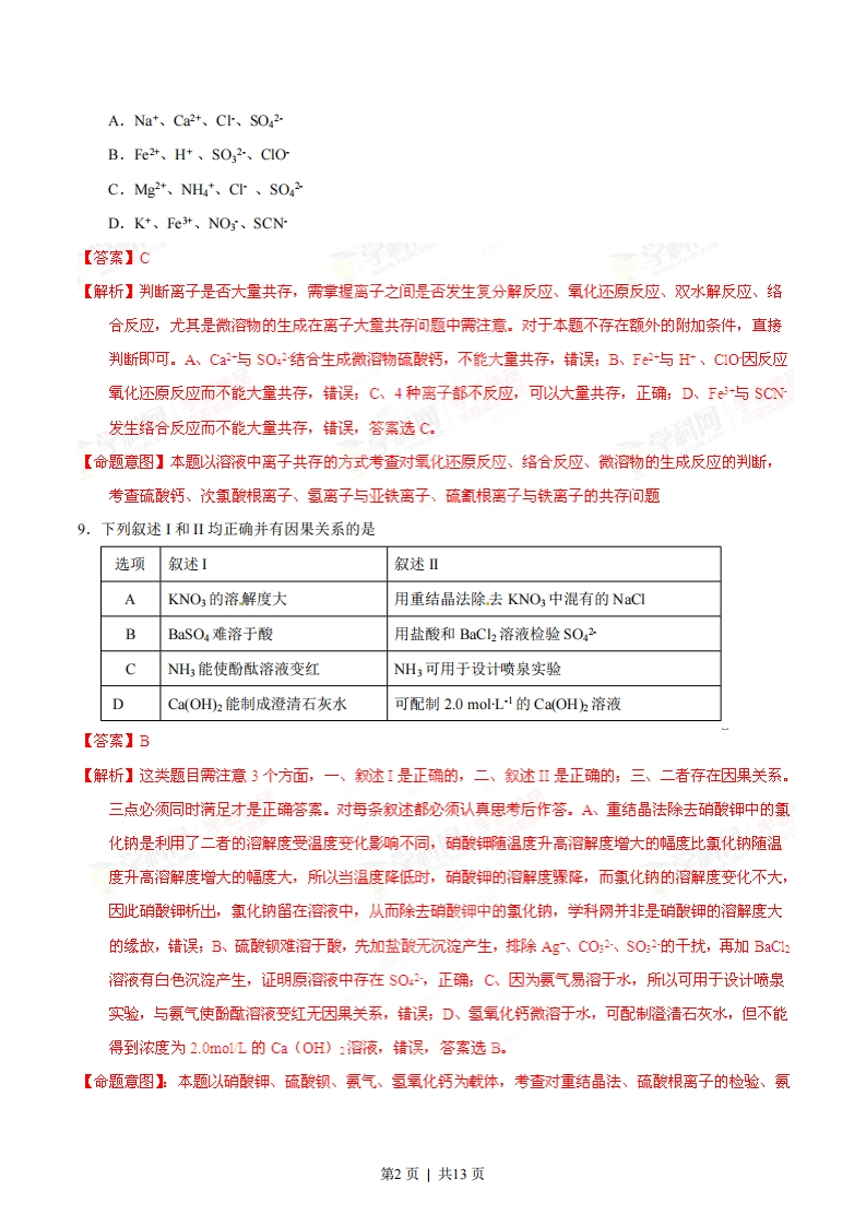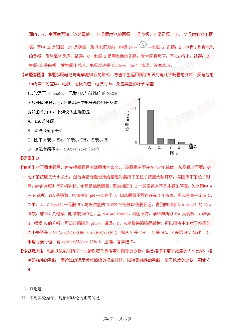 2014普通高等学校招生全国统一考试(广东卷)理科综合能力刻试化学试题卷【试卷总评】本试卷整体而言,难度适中,考点覆盖化学与生活、阿伏加德罗常数、氧化还原反应、离子反应、电化学、元素周期表与元素周期律、化学反应与能量、化学平衡理论、溶液中的离子平衡、物质性质、有机化学、实验的设计等,选择题的难度偏易,与往年考查的知识点大致相同,学生一般都能作答。非选择题的难度适中,其中31题的(2)小题不易作答,尤其(2)小题,学生都能做出答案,但是否紧扣标准答案就很难说了,我本人认为属于发散型题目,判卷人不必死扣答案;(4)小题我认为出的不好,这道题的答案是C02,可是加入二氧化碳对3个反应都有响,都会抑制反应的进行。32题中的(4)比较好,总离子方程式的书写是一难点,该离子方程式学生从未见过,需将每步发生的离子反应应用方程式叠加法进行叠加即可得到;33题考查了学生一定的对题目所给信息的迁移能力的运用,对实验的设计能力,这类题目不易作答。估计今后的高考的大题会向学生的迁移能力、设计能力方向发展,死记硬背的知识少了,对题目的分析、理解的多了。所以考生今后多加这方面的练习。一、单选题7.生活中处处有化学。下列说法正确的是A.制饭勺、饭盒、高压锅等的不锈钢是合金B.做衣服的棉和麻均与淀粉互为同分异构体C.煎炸食物的花生油和牛油都是可皂化的饱和酯类D.磨豆浆的大豆富含蛋白质,豆浆煮沸后蛋白质变成了氨基酸【答案】A【解析】化学与生活的考查中,要注意所学知识与实际生活的联系,此如选项D即便不学化学,根据生活常识也可判断,豆浆煮沸后是不会变成氨基酸的。A、不锈钢主要是铁、碳合金,正确;B、棉、麻、淀粉都属于多糖,是高分子化合物,其分子的聚合度不同,所以不能互为同分异构体,错误,C、花生油是液态油,其成分主要是不饱和酯,而牛油是固态油,其成分主要是饱和酯,错误,D、豆浆加热煮沸属于蛋白质的变性而不是发生了水解反应生成氨基酸,错误,答案选A.【命题意图】本题以合金、多糖、油脂、蛋白质为载体,考查学生对物质的性质、成分的判断,同分异构体的判断8.水溶液中能大量共存的一组离子是第1页|共13页A.Nat、Ca2+、C、SO2B.Fe2+、Ht、S032、Cl0C.Mg2+、NH+、CI、SO2D.Kt、Fet、NOs、SCN【答案】c【解析】判断离子是否大量共存,需掌握离子之间是否发生复分解反应、氧化还原反应、双水解反应、络合反应,尤其是微溶物的生成在离子大量共存问题中需注意。对于本题不存在额外的附加条件,直接判断即可。A、Ca与SO:2结合生成微溶物疏酸钙,不能大量共存,错误;B、Fe2与H、CO因反应氧化还原反应而不能大量共存,错误;C、4种离子都不反应,可以大量共存,正确;D、F:与SCN发生络合反应而不能大量共存,错误,答案选C。【命题意图】本题以溶液中离子共存的方式考查对氧化还原反应、络合反应、微溶物的生成反应的判断,考查硫酸钙、次氯酸根离子、氢离子与亚铁离子、疏根离子与铁离子的共存问题9.下列叙述I和Ⅱ均正确并有因果关系的是选项叙述I叙述ⅡAKNO3的溶解度大用重结晶法除去KNO,中混有的NaCIBBaSO4难溶于酸用盐酸和BaC2溶液检验SO,2CNH3能使酚酞溶液变红NH3可用于设计喷泉实验DCa(OH2能制成澄清石灰水可配制2.0molL1的Ca(OHh溶液【答案】B【解析】这类题目需注意3个方面,一、叙述I是正确的,二、叙述Ⅱ是正确的;三、二者存在因果关系。三点必须同时满足才是正确答案。对每条叙述都心须认真思考后作答。A、重结晶法除去硝酸钾中的氯化钠是利用了二者的溶解度受温度变化影响不同,硝酸钾随温度升高溶解度增大的幅度比氯化钠随温度升高溶解度增大的幅度大,所以当温度降低时,硝酸钾的溶解度骤降,而氯化钠的溶解度变化不大,因此硝酸钾析出,氯化钠留在溶液中,从而除去硝酸钾中的氯化钠,学科网并非是硝酸钾的溶解度大的绿故,错误;B、硫酸钡难溶于酸,先加盐酸无沉淀产生,排除Ag、C0:2、S0:2的干扰,再加BaC1:溶液有白色沉淀产生,证明原溶液中存在$0:,正确:C、因为氨气易溶于水,所以可用于设计喷泉实验,与氨气使酚酥溶液变红无因果关系,错误;D、氢氧化钙微溶于水,可配制澄清石灰水,但不能得到浓度为2.0mo1L的Ca(OH):溶液,错误,答案选B.【命题意图】本题以硝酸钾、硫酸钡、氨气、氢氧化钙为载体,考查对重结晶法、硫酸根离子的检验、氨第2页1共13页气的喷泉实验、氢氧化钙溶液的配制的判断,对物质性质的描述是否存在因果关系的判断10.设NA为阿伏伽德罗常数的数值。下列说法正确的是A.1mol甲苯含有6Na个C-H键B.18gH0含有10Na个质子C.标准状况下,22.4L氨水含有NA个NH3分子D.56g铁片投入足量浓硫酸中生成NA个SO2分子【答案】B【解析】阿伏加德罗常数是每年高考题中必现的题目,在这类题目中要注意与22.4Lmo1有关的描述、氧化还原反应中得失电子的数目、盐溶液中水解离子的数目、质子数、中子数、化学键的数目、由同位素原子构成的物质的摩尔质量、氧化还原反应中与浓度有关的问题等的判断,所以读题需认真,做题需谨慎。A、根据甲苯的结构简式判断1m0甲苯含有8Na个CH键,错误;B、1个水分子中含有10个质子,18g水的物质的量是1mol,所以18gH:0含有10mo1即10NA个质子,正确:C、标准状况下氨水不是气体,所以不能计算其物质的量,错误,D、铁在常温下与浓硫酸发生钝化,加热可使反应继