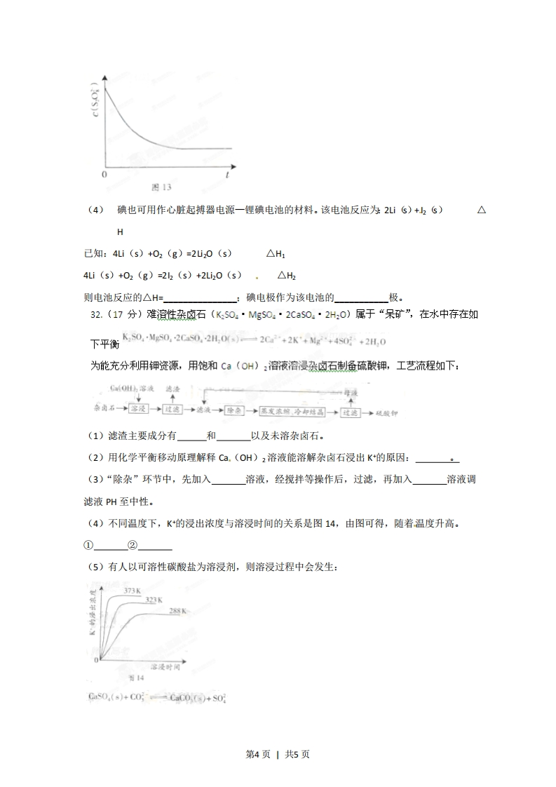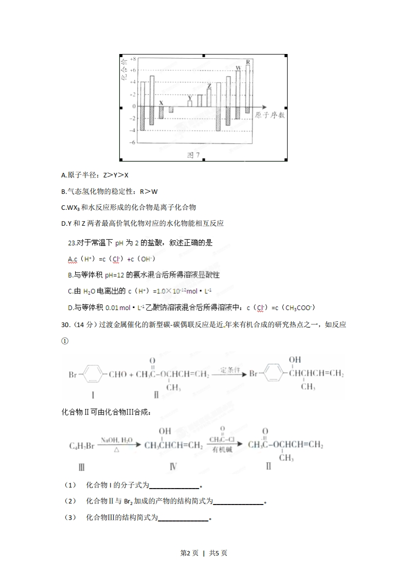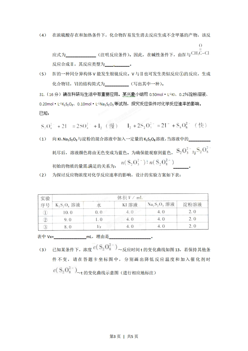 2012年广东高考理综化学部分试卷解析学生版7、化学与生活息息相关,下列说法不正确的是A用食醋可除去热水壶内壁的水垢B淀粉,油脂和蛋白质都是高分子化合物C自行车钢价生锈主要是电化学腐蚀所致D新型复合材料使用手机,电脑能电子产品更轻巧,使用和新潮8、在水溶液中能大量共存的一组是A Fe2+Al ClO.Cr B K+Cu2+OH-NOC NH Na Br SOD Mg2+H SiO SO29下列实验能达到目的的是A用溴水鉴别苯和乙烷B用Bacl2溶液鉴别SO和SOC用浓HNO:与Cu反应制备NO:D将混有HCL的C2通入饱和NaHCO:溶液中除去d10、下列应用不涉及氧化还原反应的是ANa2O2用作呼吸面具的供氧剂B工业上电解熔融状态AlO3制备AlC工业上利用合成氨实现人工固氮D实验室用NHgCl和C(OHh制备NH311、设%为阿伏加德罗常数的数值,下列说法正确的是A常温下,4gCH:含有a个C-H共价B1 mol Fe与总量的稀HNO反应,转移2e个电子C1L0.1mol·L NaHC03液含有0.1na个HCO:D常温常压下,22.4L的N02和C02合气体含有2ne个0原子12、下列陈述IⅡ正确并且有因果关系的是22.图7是部分周期元素化合价与原子序数的关系图,下列说法正确的是第1页1共5页+8+6原子序数图7A.原子半径:Z>Y>XB.气态氢化物的稳定性:R>WC.WX3和水反应形成的化合物是离子化合物D.Y和Z两者最高价氧化物对应的水化物能相互反应23.对于常温下pH为2的盐酸,叙述正确的是As(H)=c(C处)+c(OH)B.与等体积pH=12的氨水混合后所得溶液显酸性C.由H20电离出的c(H)=1.0X102mol·L1D.与等体积0.01mol·L4乙酸钠溶液混合后所得溶液中:c(C处)=C(CH:C00)30.(14分)过渡金属催化的新型碳-碳偶联反应是近年来有机合成的研究热点之一,如反应①0OHBrCHO+CH,C-OCHCH=CH,定条,BrCHCHCH=CH,CHCH,1化合物Ⅱ可由化合物III合成:OH00C.H-Br-NaoH HO CH,CHCH=CH2△CHC-C>CH.C-OCHCH=CH有机碱CH,ⅢN(1)化合物1的分子式为(2)化合物Ⅱ与Bz加成的产物的结构简式为】(3)化合物Ⅲ的结构简式为第2页丨共5页(4)在浓硫酸存在和加热条件下,化合物Ⅳ易发生消去反应生成不含甲基的产物,该反0应式为(注明反应条件)。因此,在碱性条件下,由V与CHC-C反应合成Ⅱ,其反应类型为(5)V的一种同分异构体V能发生银镜反应。V与Ⅱ也可发生类似反应①的反应,生成化合物Ⅵ,Ⅵ的结构简式为(写出其中一种)。31.(16分)碘在科研与生活中有重要应用。某兴趣小组用0.50mol·K1、0.2%淀粉溶液、0.20mcl·LK2S2Qa0.10mol·L4NaSz0:等试刑,探究反应条件对化学反应速率的影响。已知:S,0+21=2s0+12(慢)12+25,0=21+S,02(快)(1)向K1、Na2S203与淀粉的混合溶液中加入一定量的K2S20g溶液,当溶液中的,耗尽后,溶液颜色将由无色变成为蓝色。为确保能观察到蓝色,S,0}与S,0初始的物质的量需满足的关系为:n(S,0):n(S,0)(2)为探讨反应物浓度对化学反应速率的影响,设计的实验方案如下表:实验体积V/mL序号K,S,0,溶液水KI溶液Na,S,0,溶液淀粉溶液①10.00.04.04.02.0②9.01.04.04.02.038.0Vx4.04.02.0表中Vx=mL,理由是(3)已知某条件下,浓度(S,0)一反应时间:的变化曲线如图13,若保持其他条件不变,请在答题卡坐标图中,分别画出降低反应温度和加入催化剂时c(S,0;)t的变化曲线示意图(进行相应地标注)第3页丨共5页